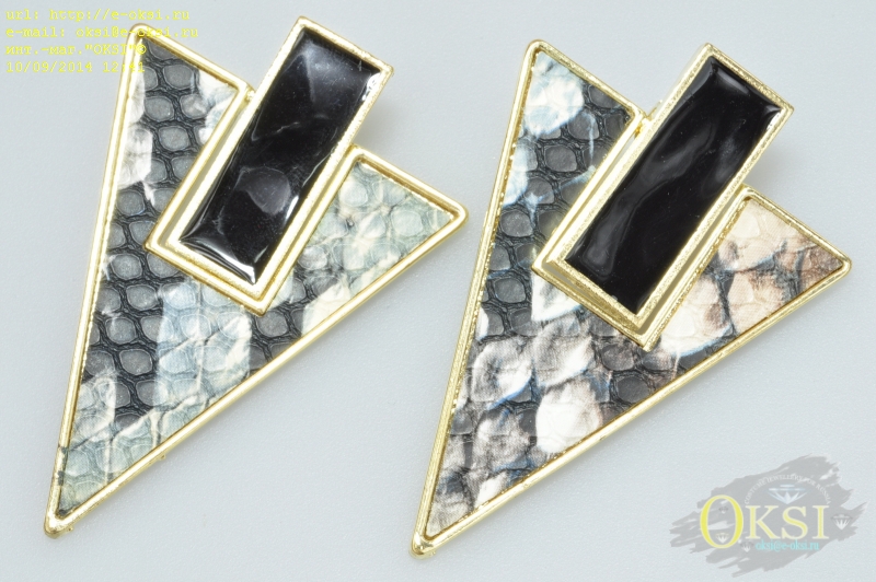 Стильные серьги со «змеиным» принтом из искусственной кожи и черной эмали. Внимание окружающих привлекает необычная форма украшения, модная в этом сезоне. Размер 6 см. х 4 см.. Качественное гальваническое покрытие золотого цвета.