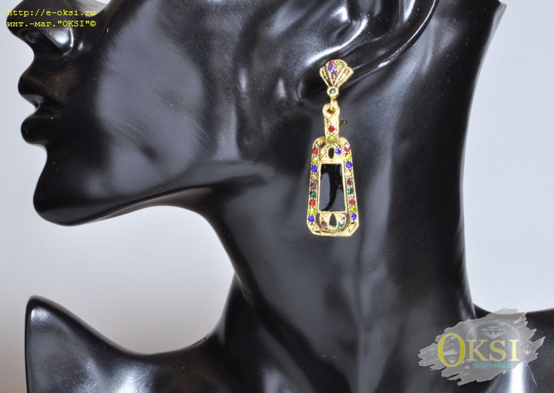 Классические серьги, в стиле «Старинное золото». Ручная роспись эмалью черного цвета. Качественное гальваническое покрытие, мелкие разноцветные кристаллы. Длина 5,5 см., ширина 1,5 см. Английская застежка.