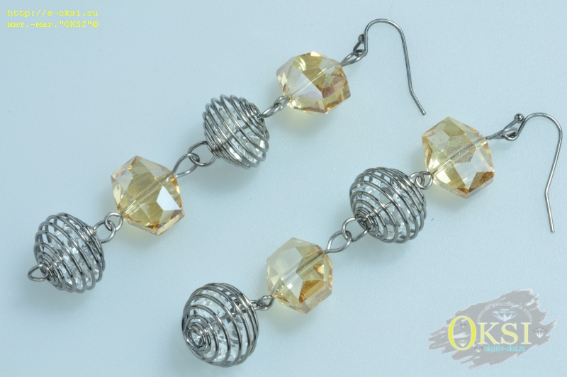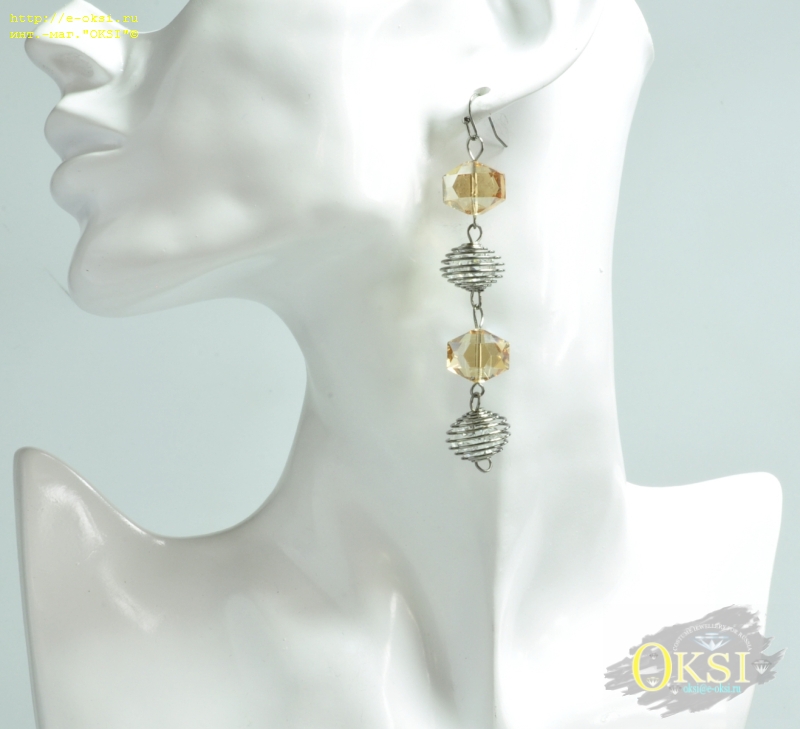 Очаровательные, длинные серьги ( ручная работа) из чешского хрусталя янтарного оттенка и металлическими пружинками, сквозь которую поблескивают сверкающие кристаллы, находящиеся внутри . Идеально подходит к колье 31100014.