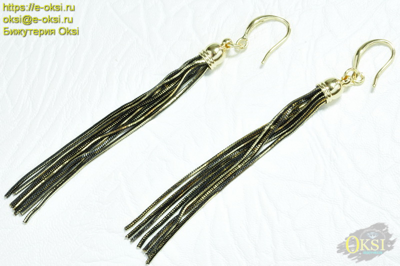Модные длинные серьги с кисточками из цепочек золотого и черненого цвета. Роскошное сочетание золотого и черного цвета позволяет носить украшение и днем, и вечером. Качественное гальваническое покрытие. Длина серьги вместе с застежкой 9 см.