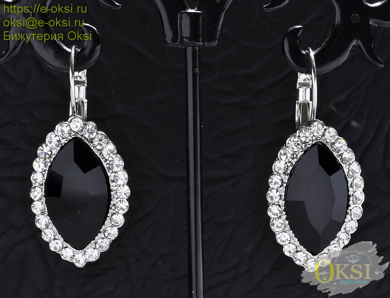 Роскошные, крупные серьги с черным кристаллом, в обрамлении сверкающих зеркальных фианитов. Качественное родиевое покрытие серебряного цвета. Размер серьги вместе с застежкой 4 см х 1,7 см. Удобный итальянский замок. Серьги идеально подходят к подвеске на цепочке 30031620 и колье 30031855.
