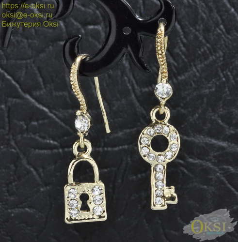 Стильные серьги "замочек с ключиком'', инкрустированы сверкающими кристаллами.'' Замок с ключом '' в украшениях символизирует - надежную защиту, сохранность чувств и гармонии в отношениях. Длина серьги вместе с застежкой 3 см. Качественное гальваническое покрытие золотого цвета.