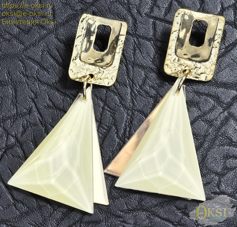 Стильные, очень лёгкие крупные серьги. Модная в этом сезоне треугольная форма состоит из двух пластин - золотой и перламутровой. Универсальный, базовый цвет подойдет к любому оттенку одежды и аксессуаров. Длина серьги вместе с застежкой 6,5 см. Качественное гальваническое покрытие золотого цвета.