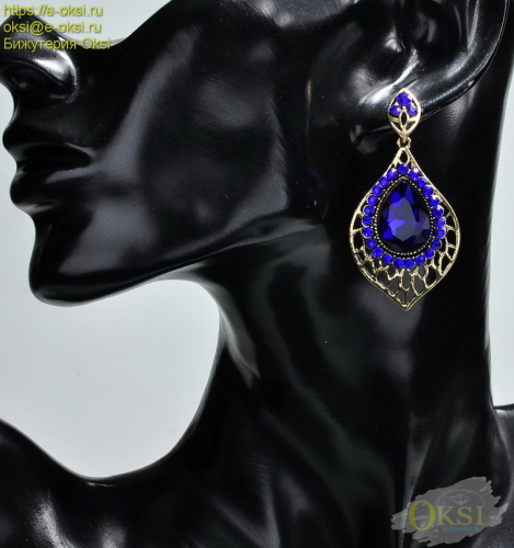 Яркие, эффектные серьги с роскошным синим кристаллом. Из всей цветовой палитры синий цвет самый неоднозначный и загадочный. Безупречно стильные сочетания синий создает с универсальным черным и белым. Очень красивые сочетания с красным и желтым, а также с золотым и серебряным цветом одежды и аксессуаров. Качественное гальваническое покрытие золотого цвета. Размер серьги 6 см х 3 см.Застёжка пуссеты.