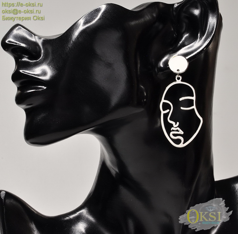 Стильные, эффектные серьги в форме лица. Качественное гальваническое покрытие серебряного цвета. Длина серьги вместе с застежкой 6 см.
