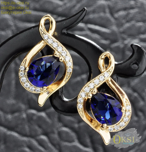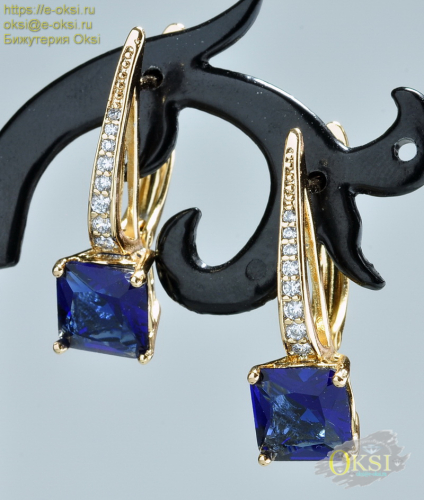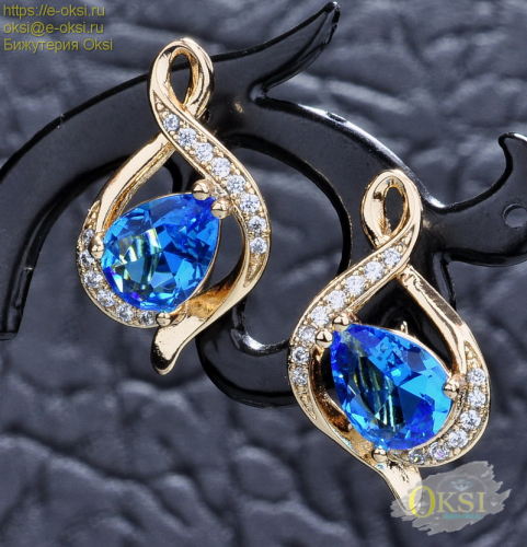 Изящные позолоченные серьги с кристаллом насыщенного лазурного оттенка, украшенных сверкающими фианитами. Удобный английский замок. Размер серьги 2 см х 1 см.