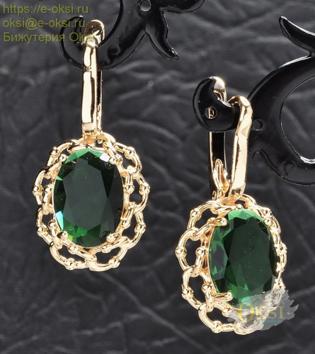 Эффектные позолоченные серьги с крупным изумрудным кристаллом. На удобном английском замке. Длина серьги вместе с замком 3,5 см.