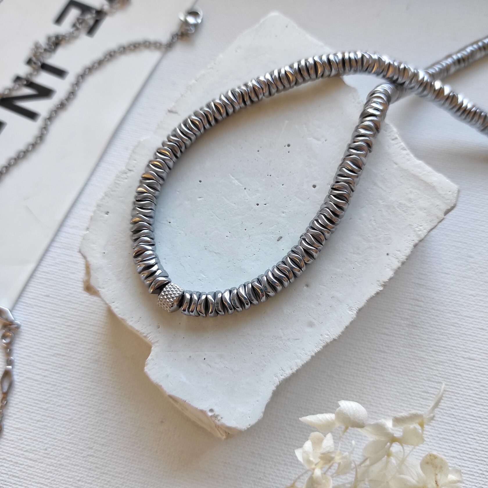 ✔️Средний чокер: Пластинки гематита 6мм в диаметре. В центре элемент из стали с фактурной поверхностью. Длина ~40см + цепочка для удлиннения 5см.