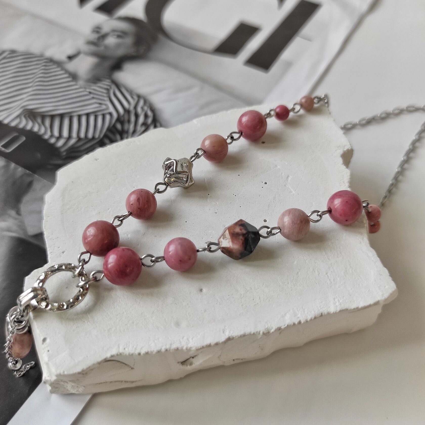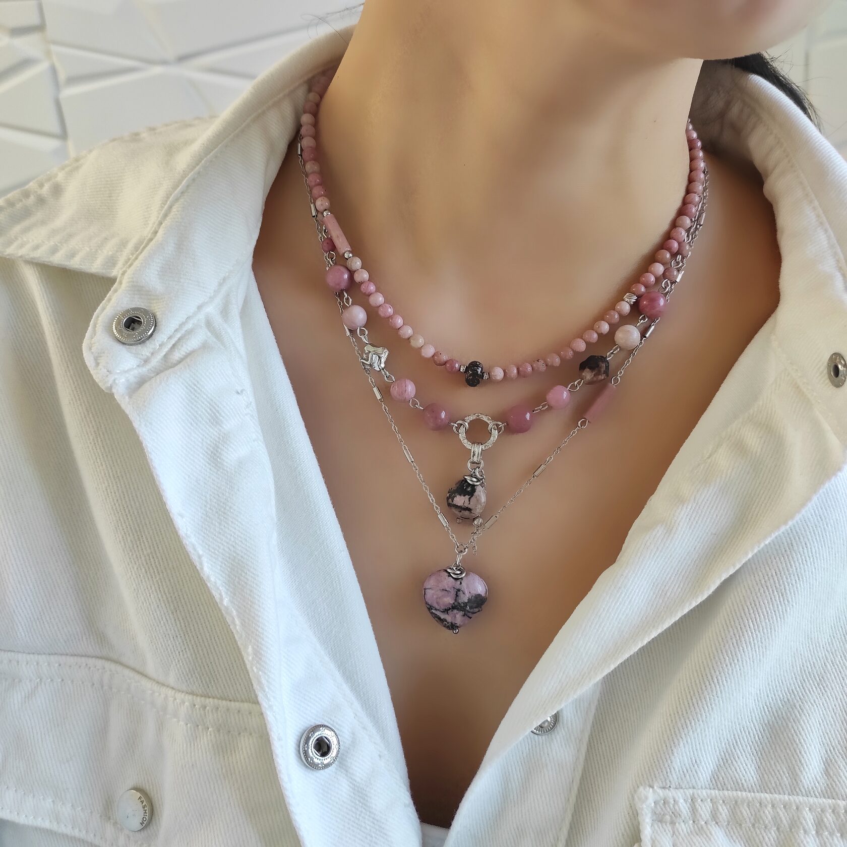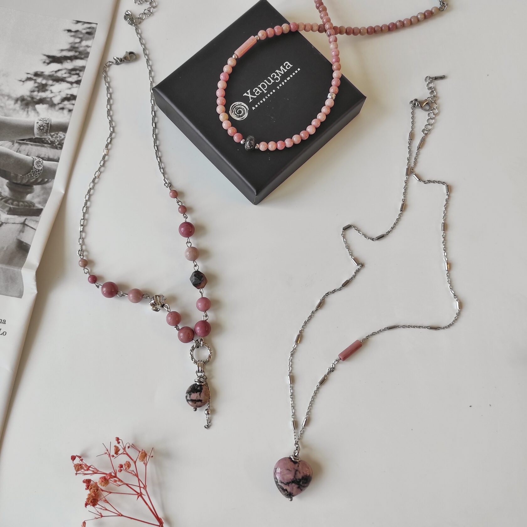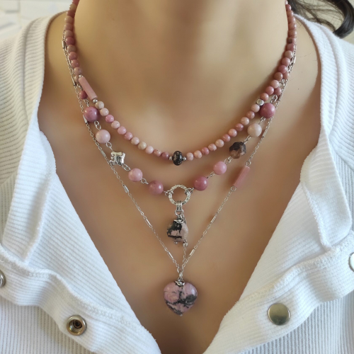 Чокер + колье из натурального родонита + цепочка с кулоном Сердце. Три украшения, которые можно носить вместе или раздельно.