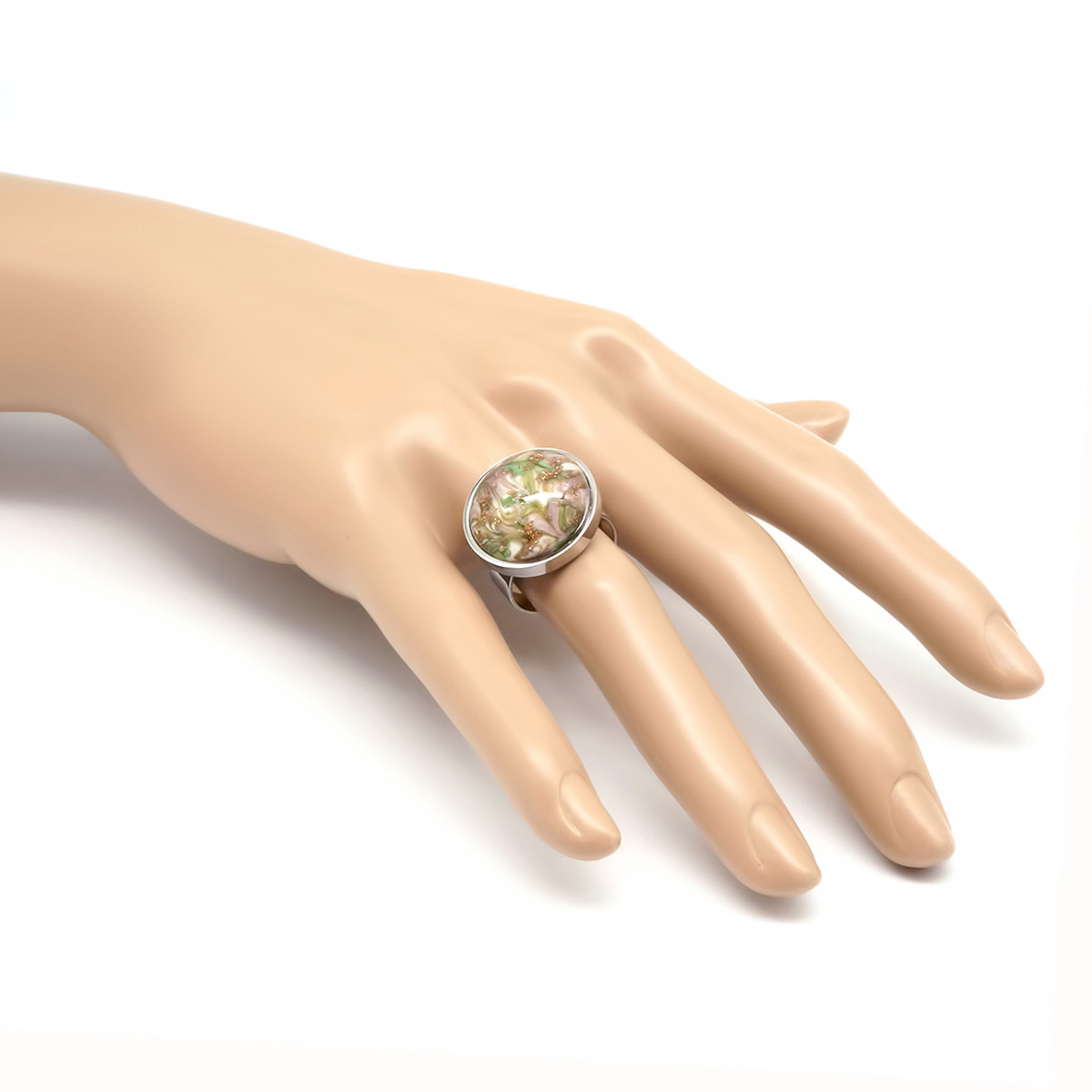 Кольцо изготовлено из муранского стекла и гипоаллергенной ювелирной стали, что очень важно для людей с чувствительной кожей. Металл не темнеет и не подвергается воздействиям окружающей среды, надолго обеспечивая красивый внешний вид изделия. Диаметр стеклянного элемента - 2 см. Кольцо безразмерное, регулируется с 16 до 19 размера. Вес - 8 гр.