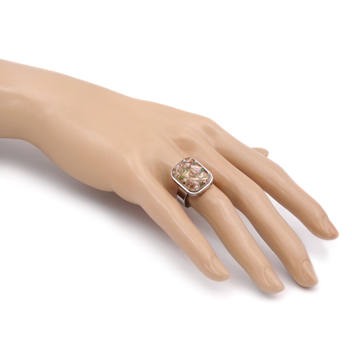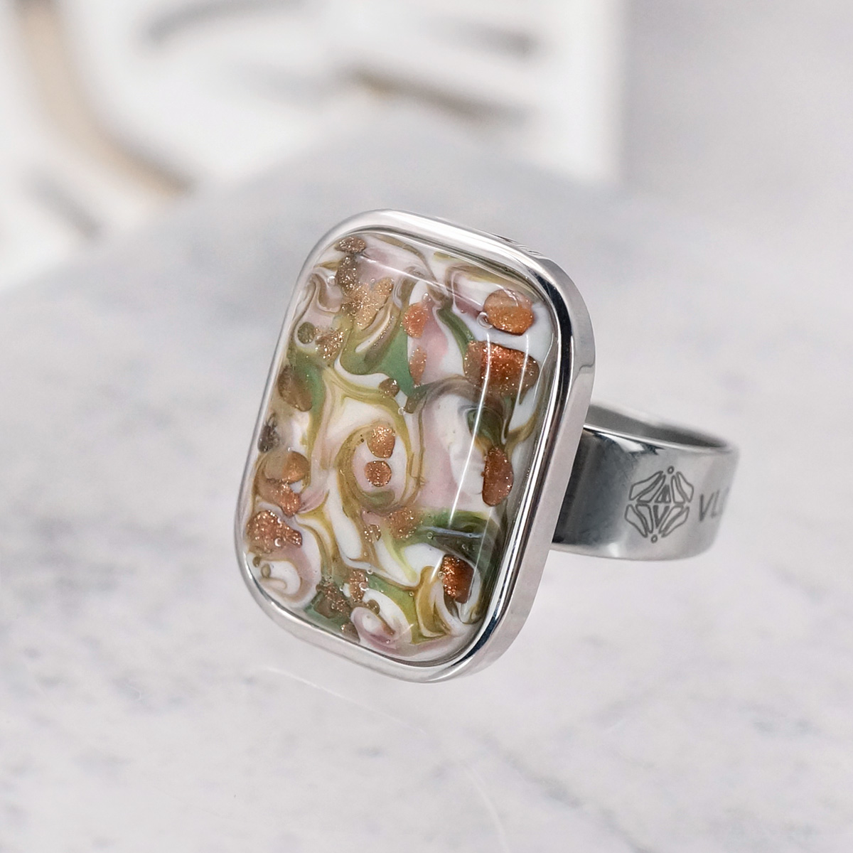 Кольцо изготовлено из муранского стекла и гипоаллергенной ювелирной стали, что очень важно для людей с чувствительной кожей. Металл не темнеет и не подвергается воздействиям окружающей среды, надолго обеспечивая красивый внешний вид изделия. Размер стеклянного элемента - 1,5x2 см. Кольцо безразмерное, регулируется с 16 до 19 размера. Вес - 6 гр.