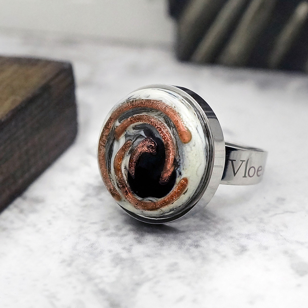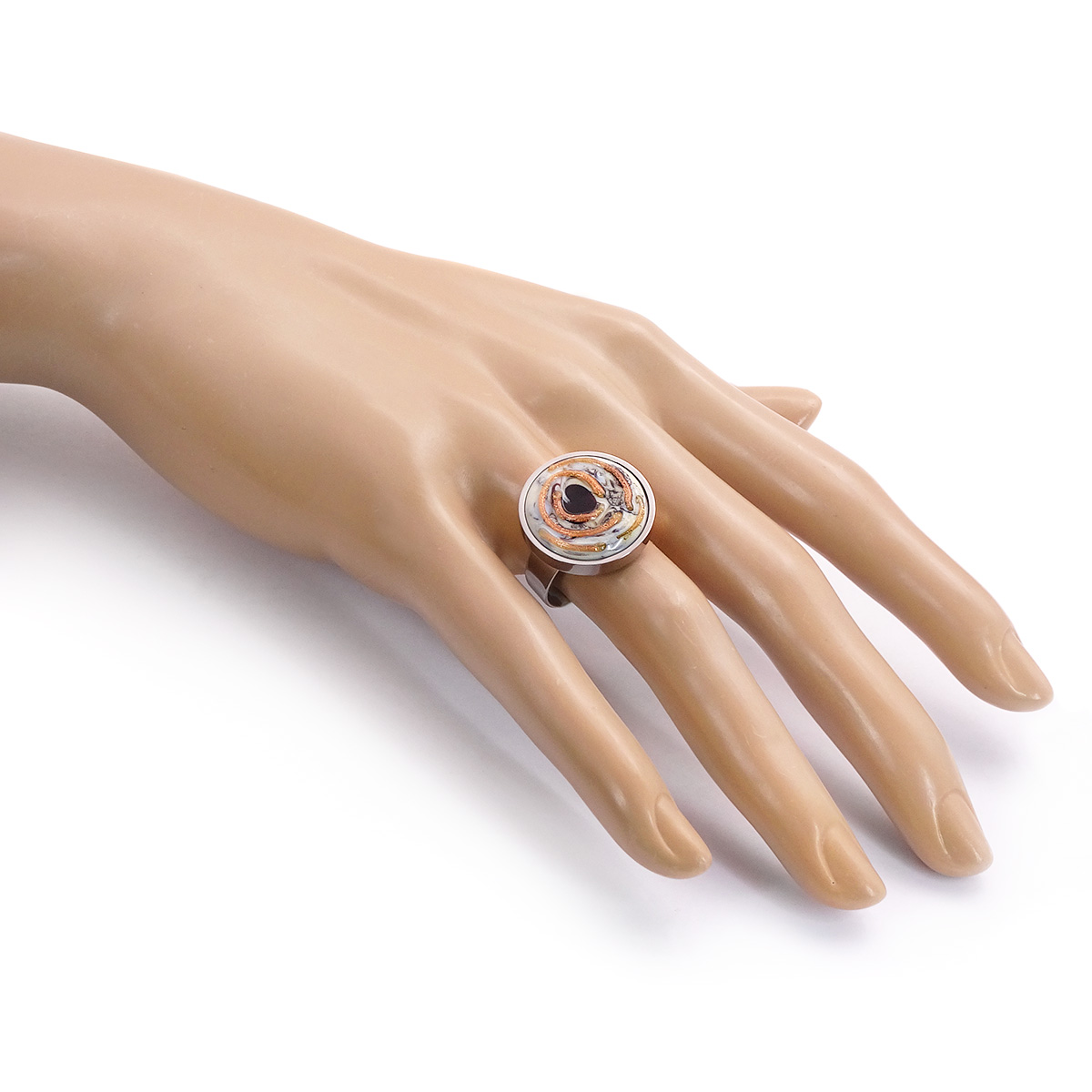 Кольцо изготовлено из муранского стекла и гипоаллергенной ювелирной стали, что очень важно для людей с чувствительной кожей. Металл не темнеет и не подвергается воздействиям окружающей среды, надолго обеспечивая красивый внешний вид изделия. Диаметр стеклянного элемента - 2 см. Кольцо безразмерное, регулируется с 16 до 19 размера. Вес - 8 гр.