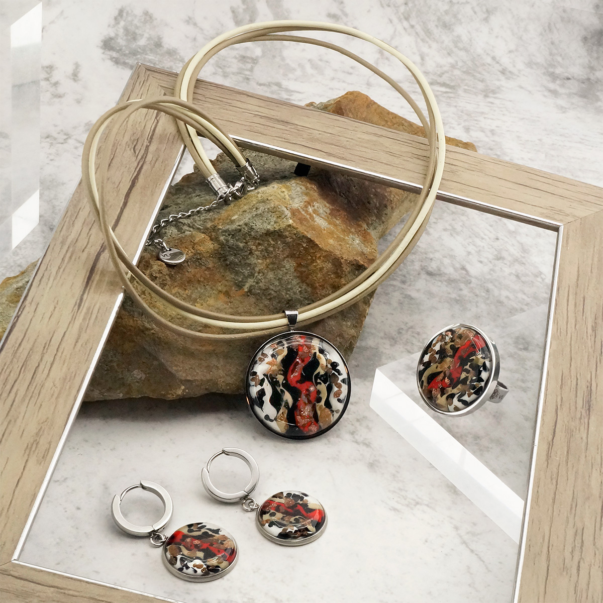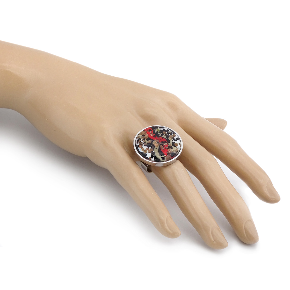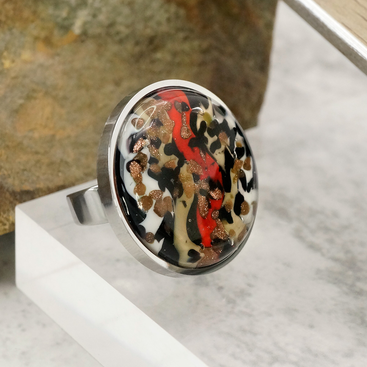Кольцо изготовлено из муранского стекла и гипоаллергенной ювелирной стали, что очень важно для людей с чувствительной кожей. Металл не темнеет и не подвергается воздействиям окружающей среды, надолго обеспечивая красивый внешний вид изделия. Диаметр стеклянного элемента - 2,5 см. Кольцо безразмерное, регулируется с 16 до 19 размера. Вес - 12 гр.