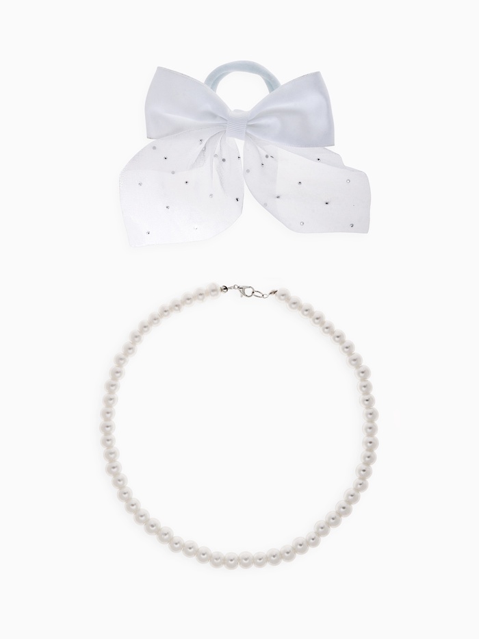 [Картинка122]Белый детский комплект украшений для девочек состоит из резинки для волос и изящных бус. Изготовленные из пластика, текстиля и металла, аксессуары объединяют практичность и стиль, подходящие для повседневного использования и особых случаев.