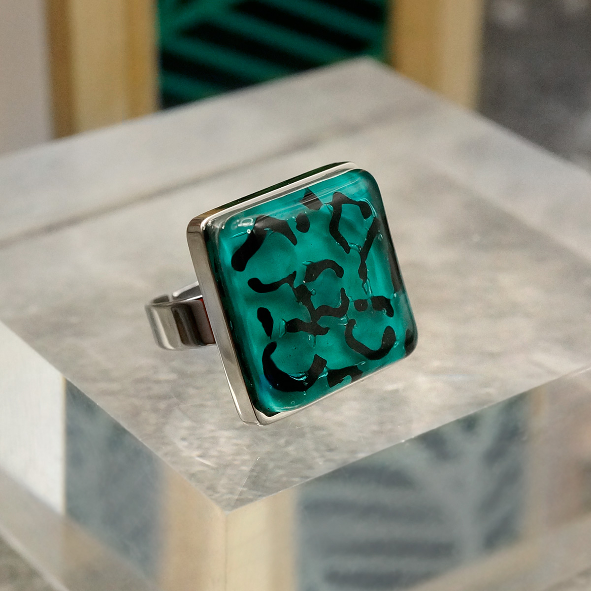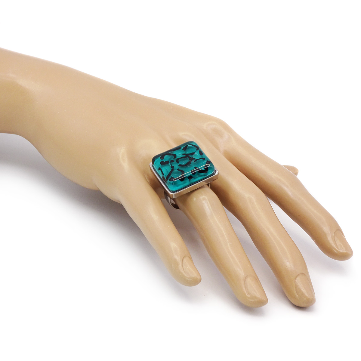 Кольцо изготовлено из муранского стекла и гипоаллергенной ювелирной стали, что очень важно для людей с чувствительной кожей. Металл не темнеет и не подвергается воздействиям окружающей среды, надолго обеспечивая красивый внешний вид изделия. Размер стеклянного элемента - 2*2 см. Кольцо безразмерное, регулируется с 16 до 19 размера. Вес - 11 гр.