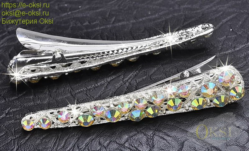 Цена за 1 штуку. Эффектная, металлическая заколка- зажим инкрустирована сверкающими, перламуировыми кристаллами. Длина заколки 8,5 см.