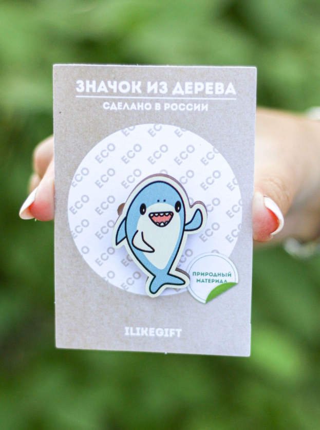 Значок выполнен из дерева с нанесением принта. На тыльной стороне застёжка в виде английской булавки. Каждый значок размещен на подложке и упакован в полиэтиленовый пакет с европодвесом. Размер подложки: 9.5х6.5 см. Произведено в России.