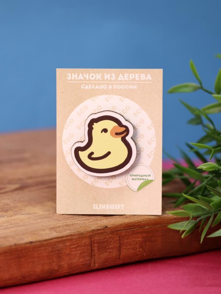 Значок выполнен из дерева с нанесением принта. На тыльной стороне застёжка в виде английской булавки. Каждый значок размещен на подложке и упакован в полиэтиленовый пакет с европодвесом.