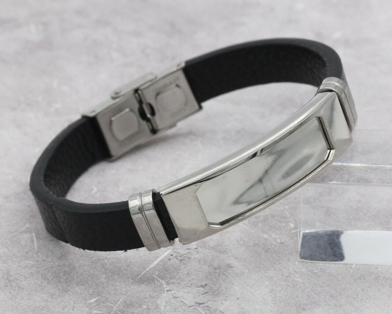 Стальной браслет из эко-кожи. Браслет подходит для гравировки. Стандартная длина браслета 20 см. Длину можно регулировать Что бы отрегулировать браслет нужно: 1. Открыть замок застежки(он с зубчиками) 2. Отмерить нужную длину 3. Аккуратно отрезать. Наши прямые заказы на ювелирные фабрики позволяют установить для вас самые низкие цены в России на наши самые лучшие качественные украшения.