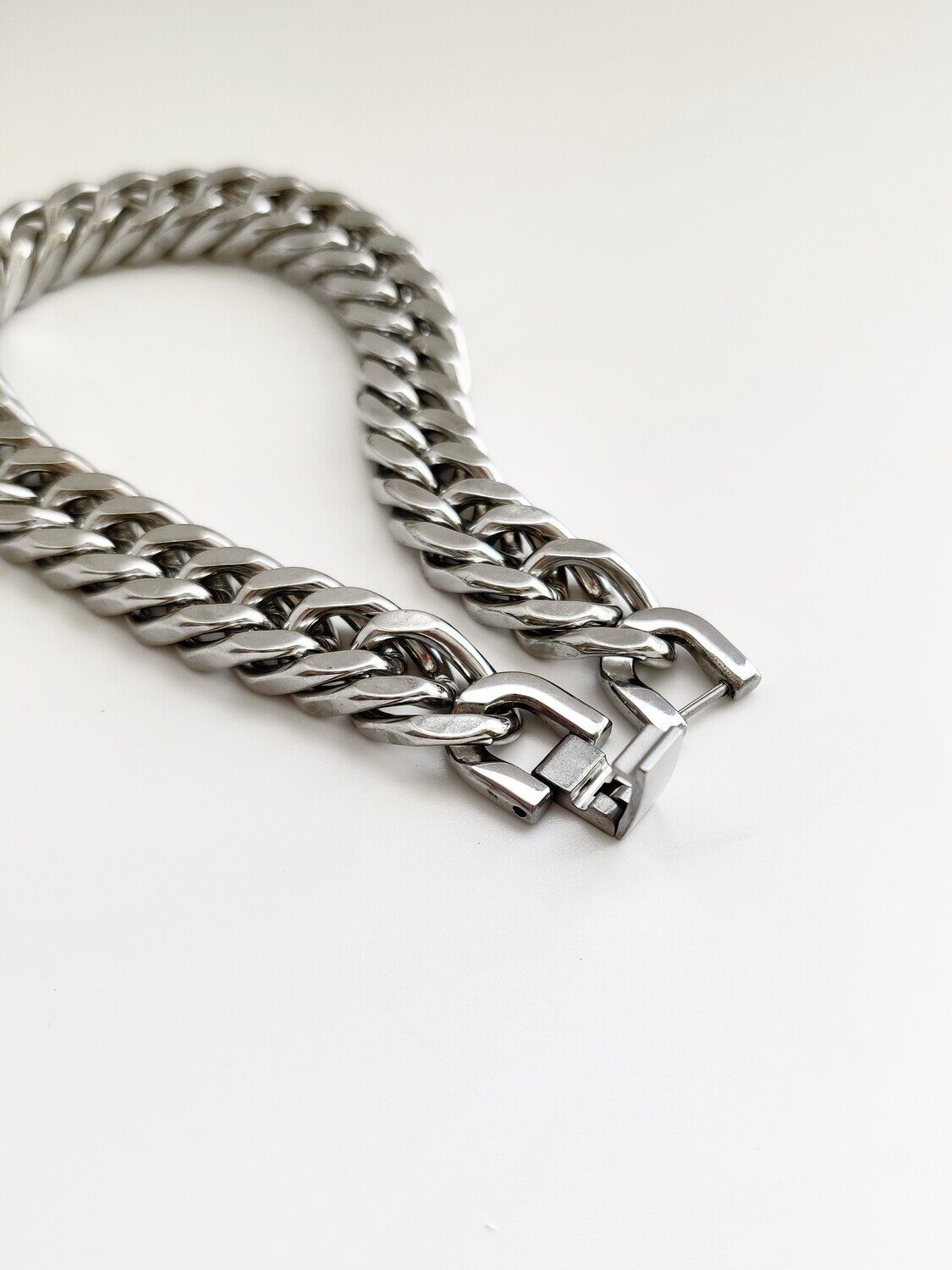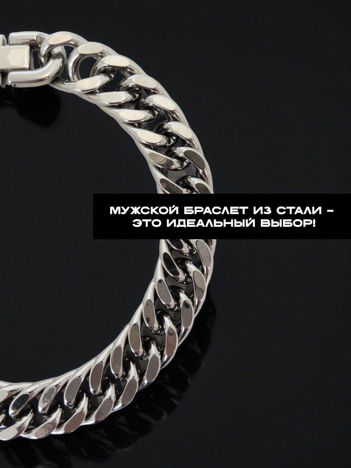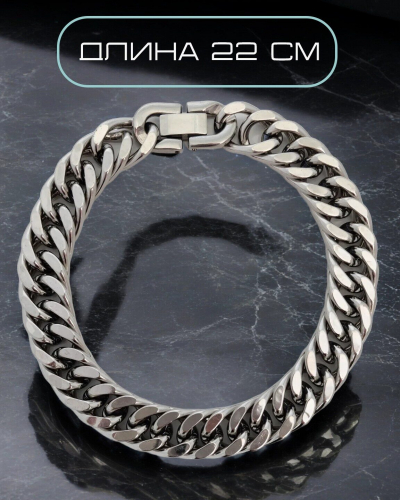 Стильный браслет из стали 316L имеет высокую износостойкость, не окисляется, не темнеет, не вызывает аллергии. Размер браслета можно регулировать убрав одно звено. Длина 24 см. Ширина браслета 1.4 мм.