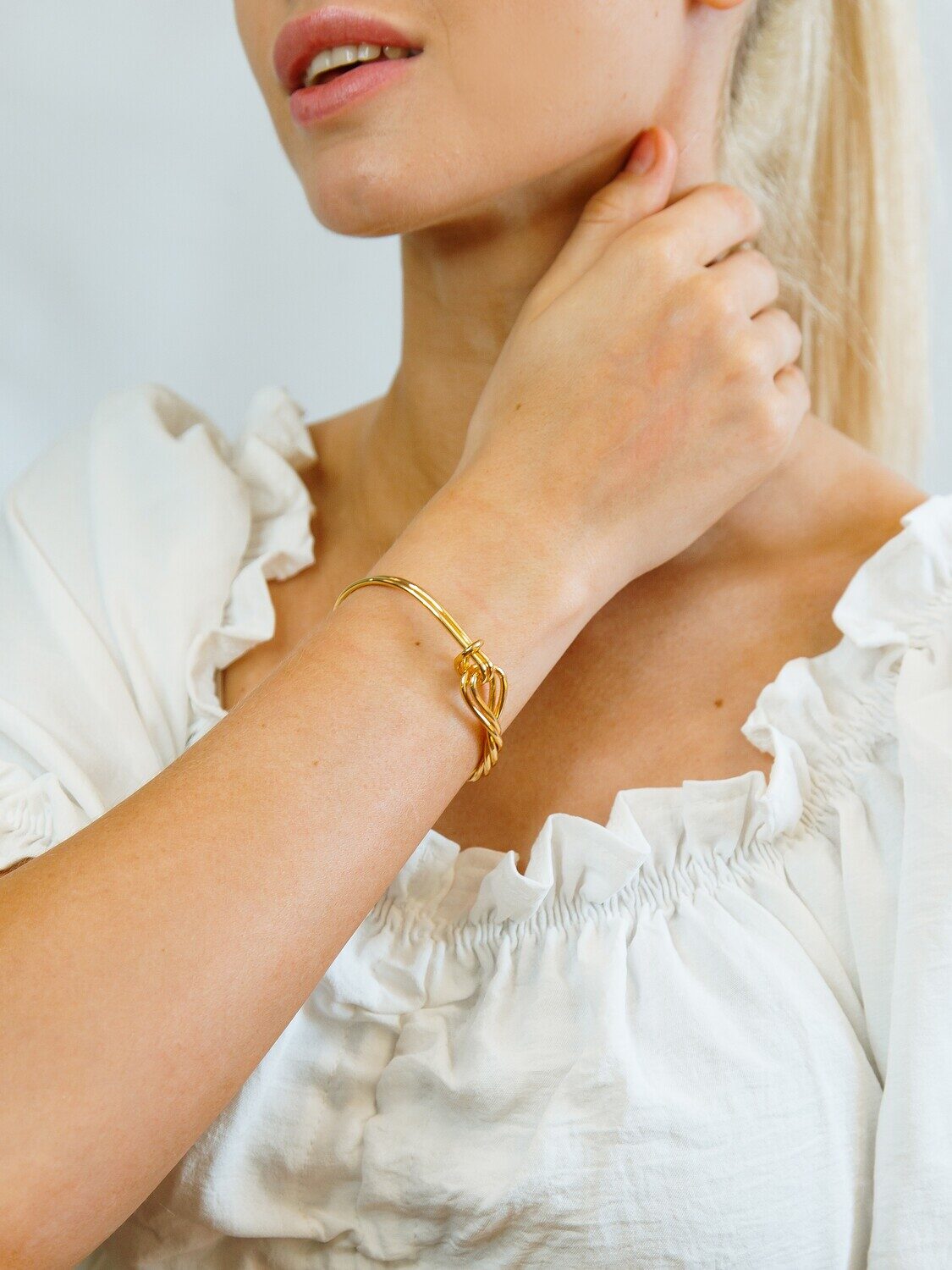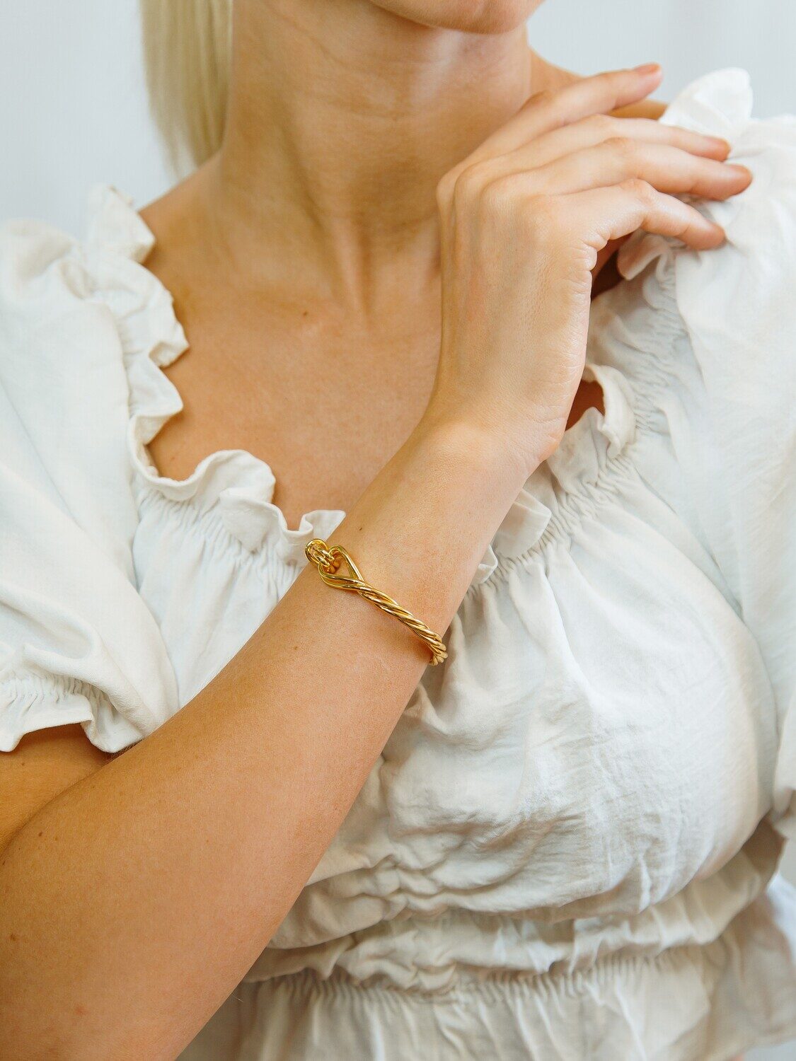 Стильный и лаконичный браслет-обруч — это аксессуар, который подойдёт как для повседневного образа, так и для особых случаев. Он выполнен из прочного гипоаллергенного ювелирного сплава, что обеспечивает его долговечность и устойчивость к повреждениям.
