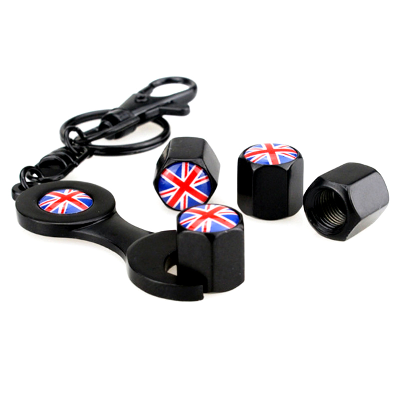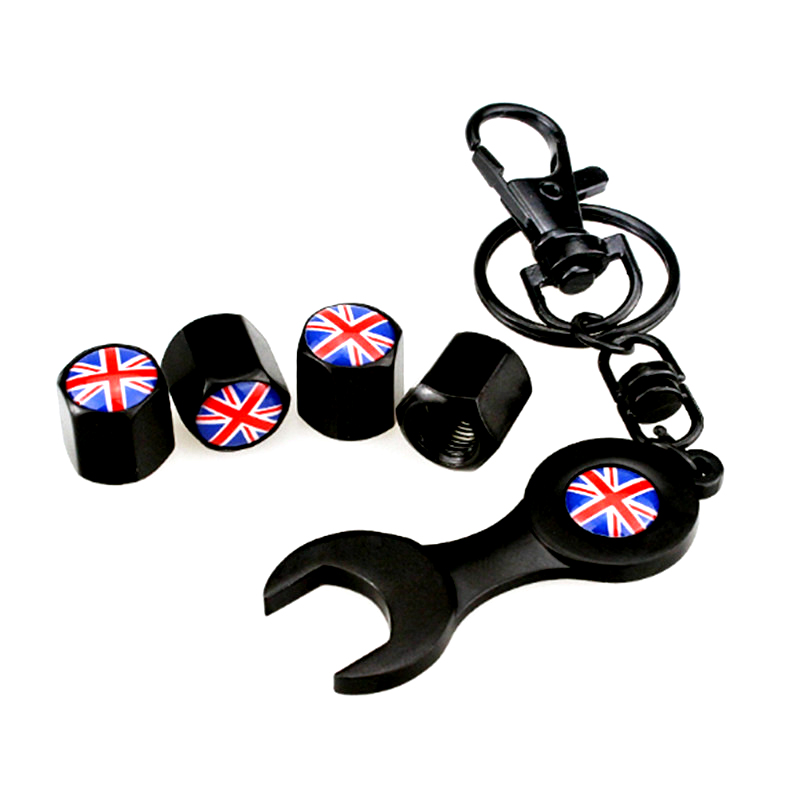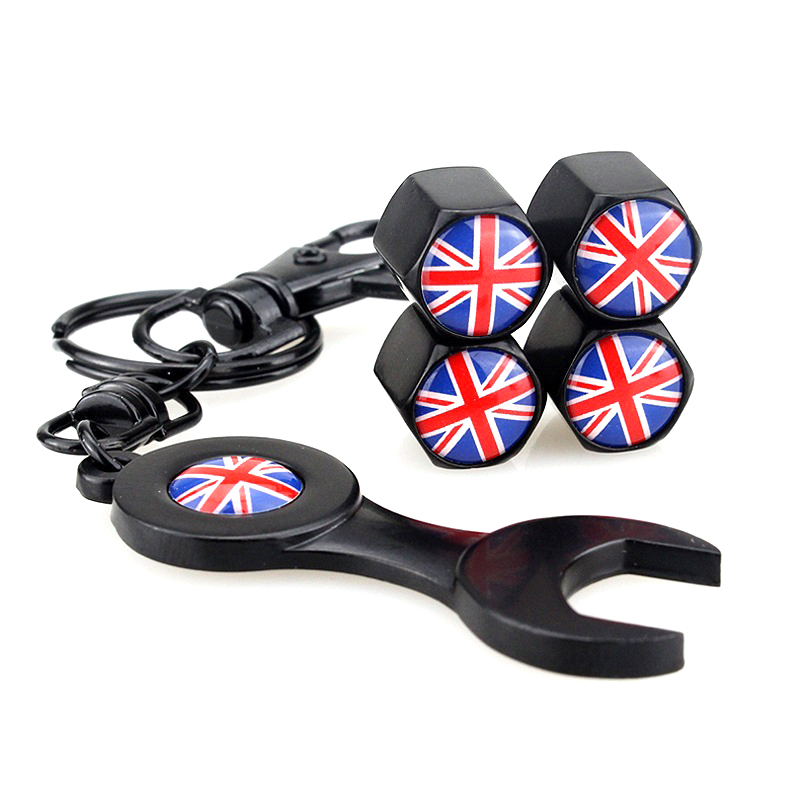 Оригинальный брелок для ключей в виде гаечного ключа, украшенного рисунком британского флага, с которым в комплекте идут самые настоящие колесные колпачки. Просто накрутите колпачок на ниппель и затяните его ключом с брелка.