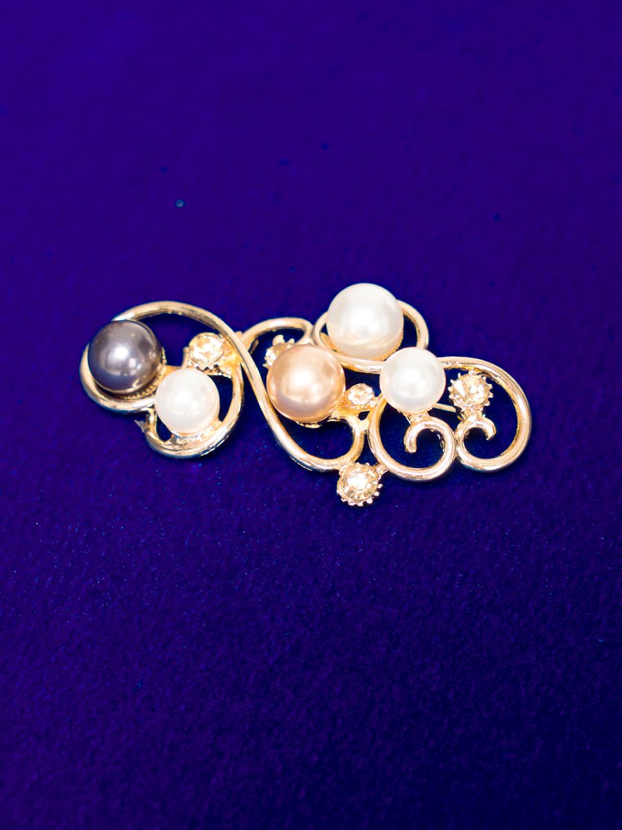 Брошь декоративная. "Жемчуг" серый, белый, бежевый. Стразы. Основа металл золотого цвета.