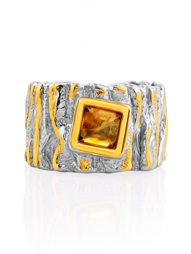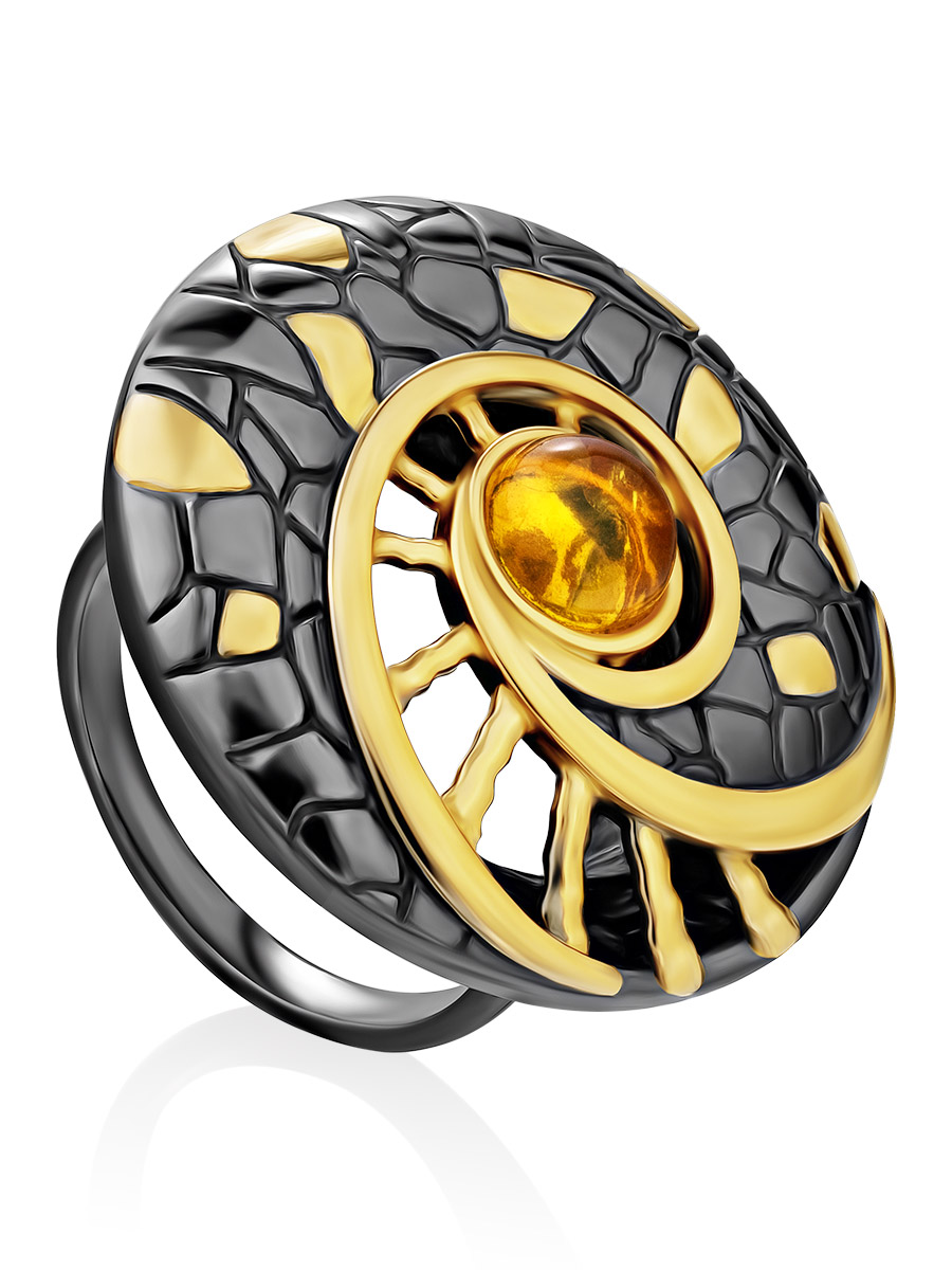 Эффектное кольцо «Донателла» с чернением и золочением, украшенное янтарём