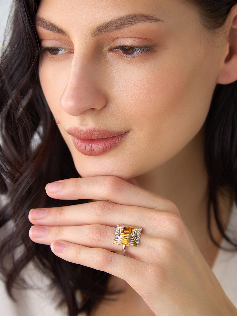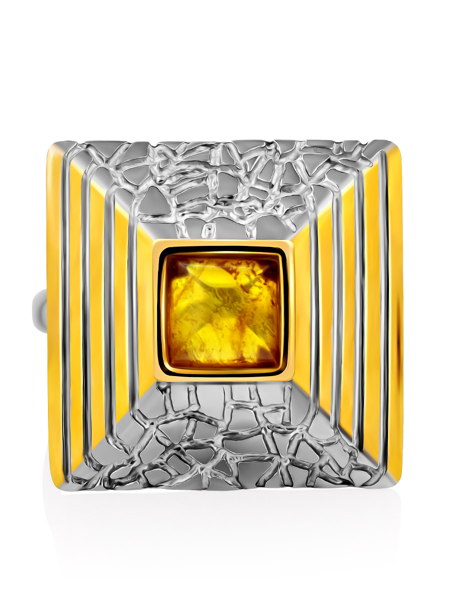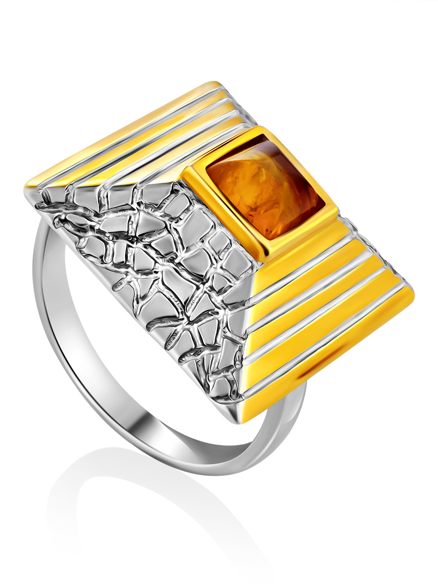 Размеры камня (мм): 5х5х3 Вес изд..показатьелия (г): 5.2 Цвет: лимонный / коньячный Материалы: Натуральный янтарь / Серебро 925° / ПозолотаСтильное серебряное кольцо с искрящимся балтийским янтарём «Колхида»: 210001426_x000D_