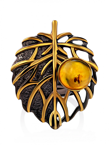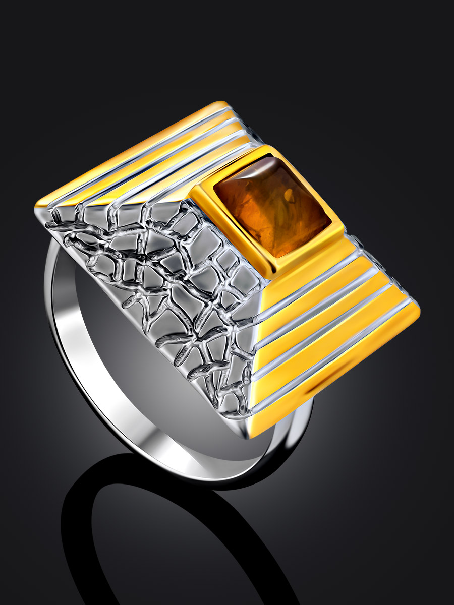 Эффектное кольцо «Колхида» из текстурного серебра с натуральным золотистым янтарём