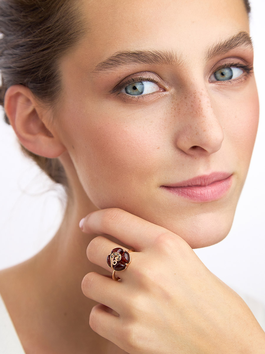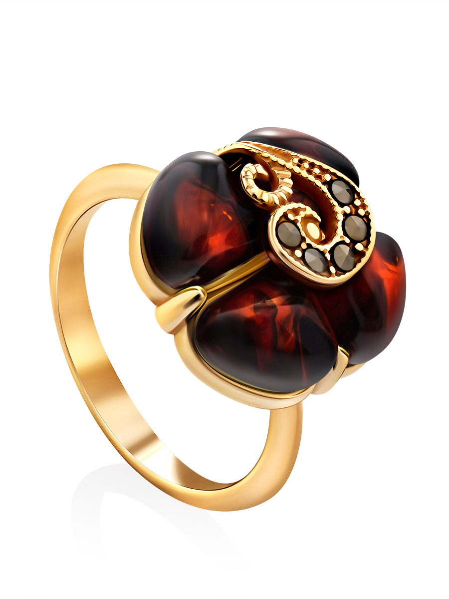Эффектное кольцо «Лола» из янтаря коньячного цвета с марказитами