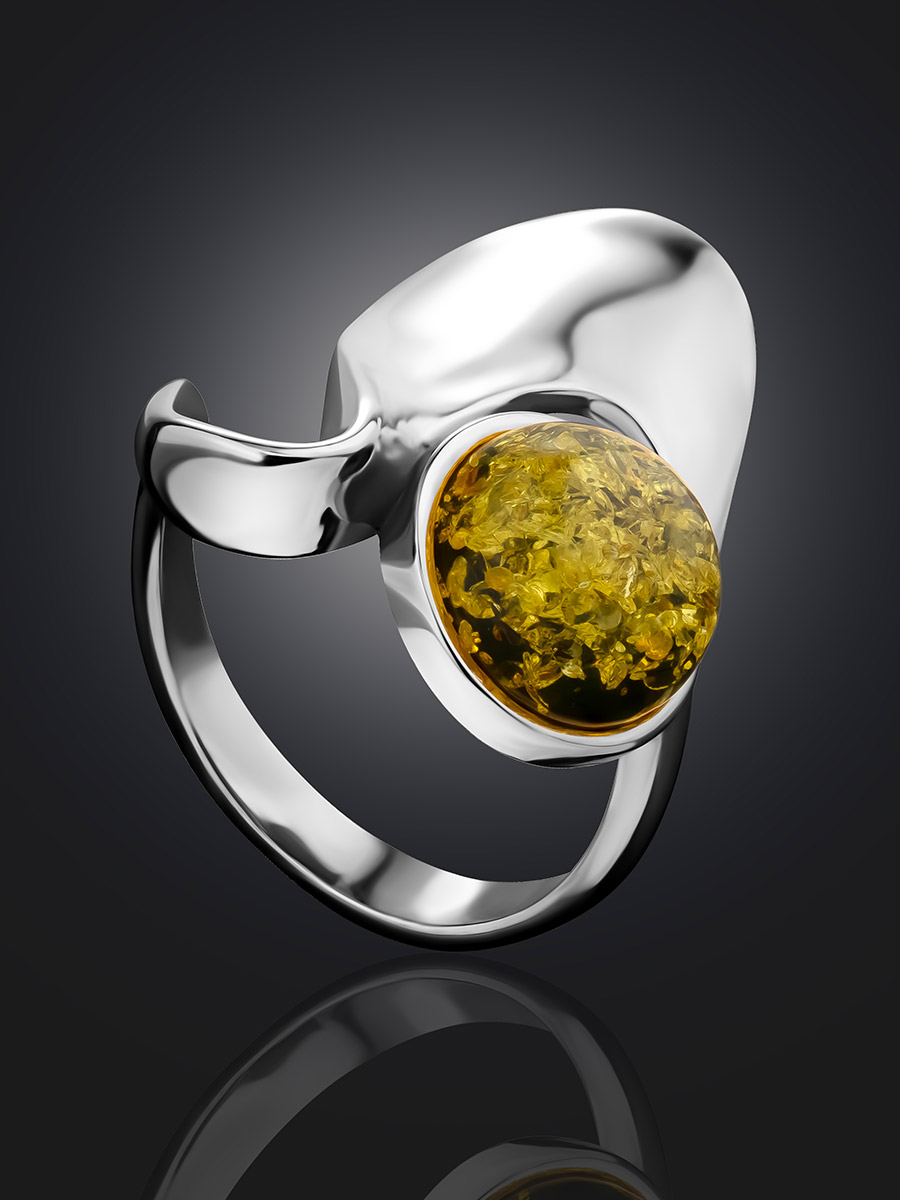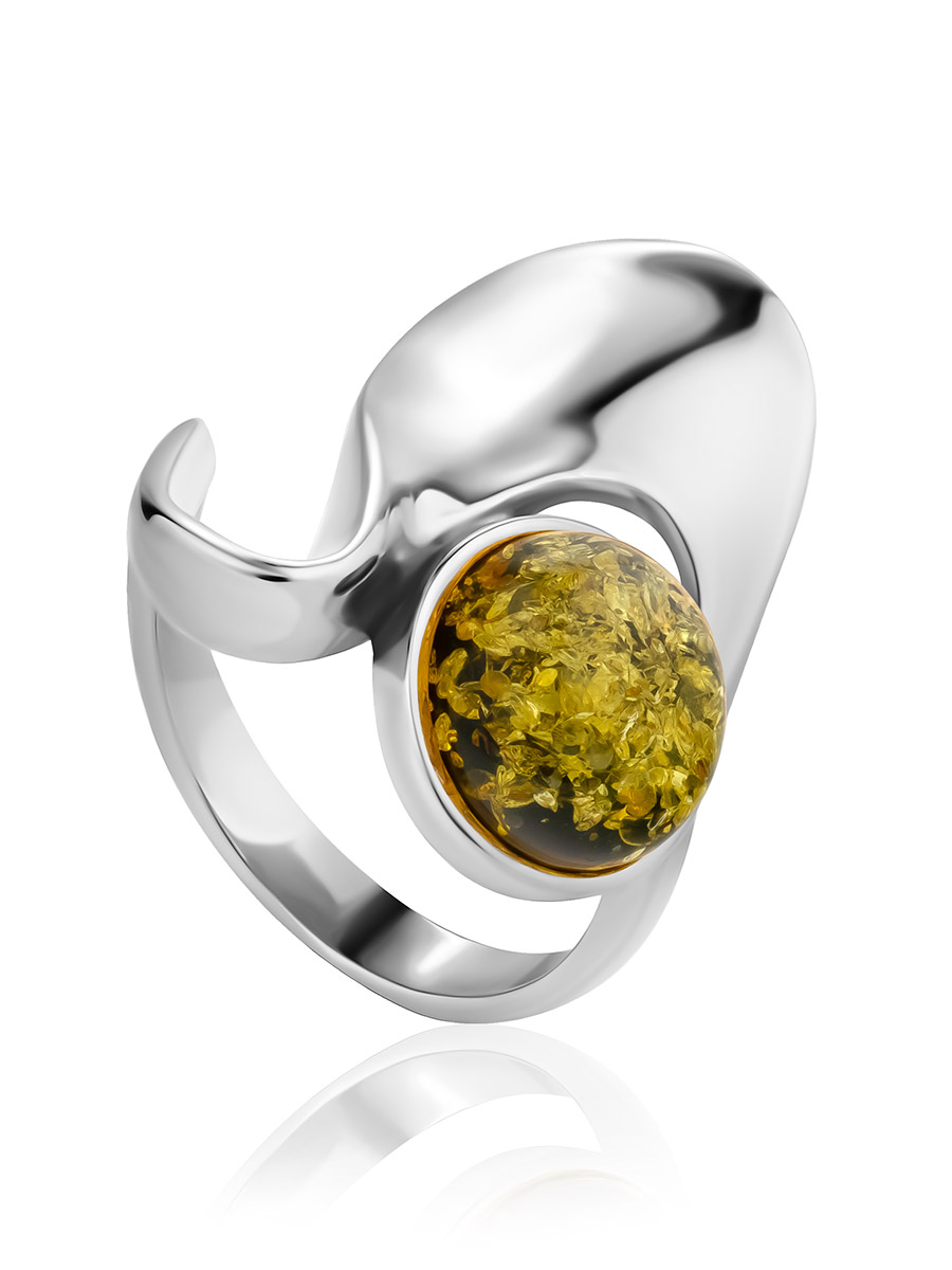 Эффектное кольцо с натуральным янтарём зелёного цвета «Маверикс»