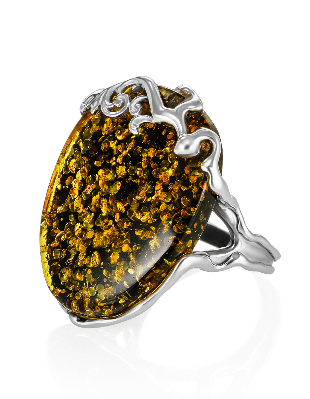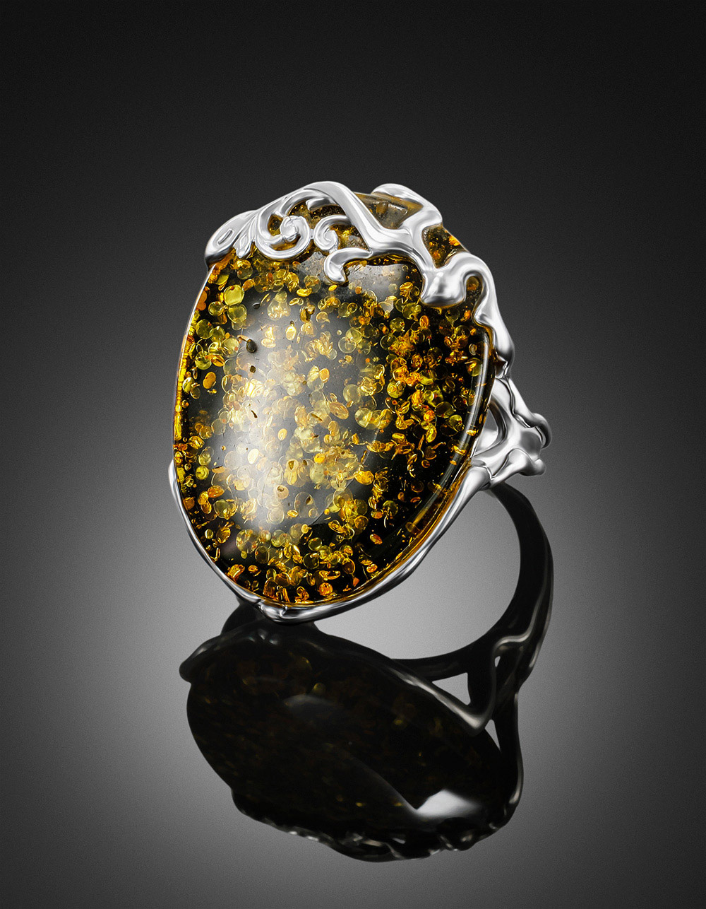 Эффектное нарядное кольцо со вставкой из янтаря зеленого цвета «Версаль»
