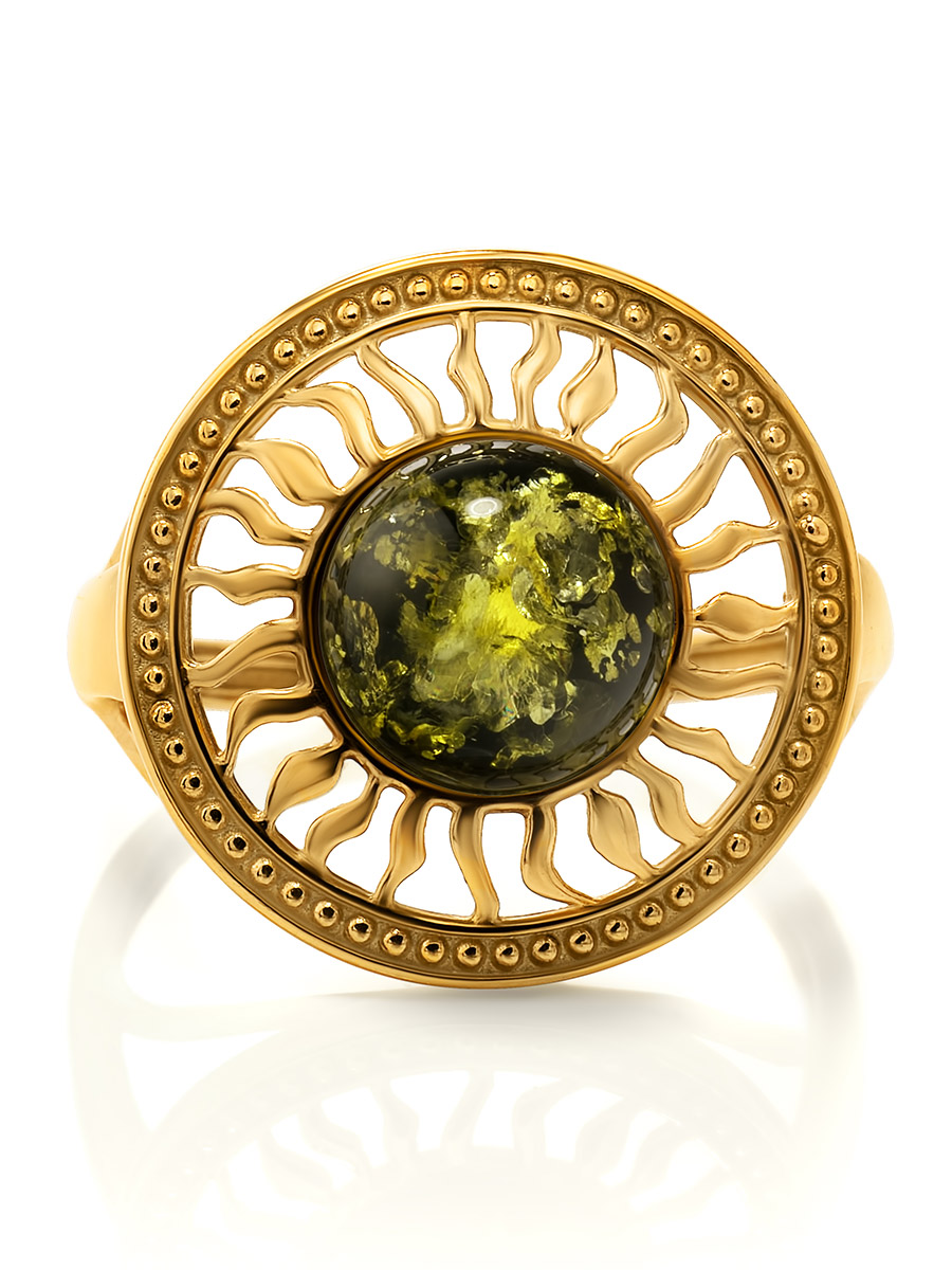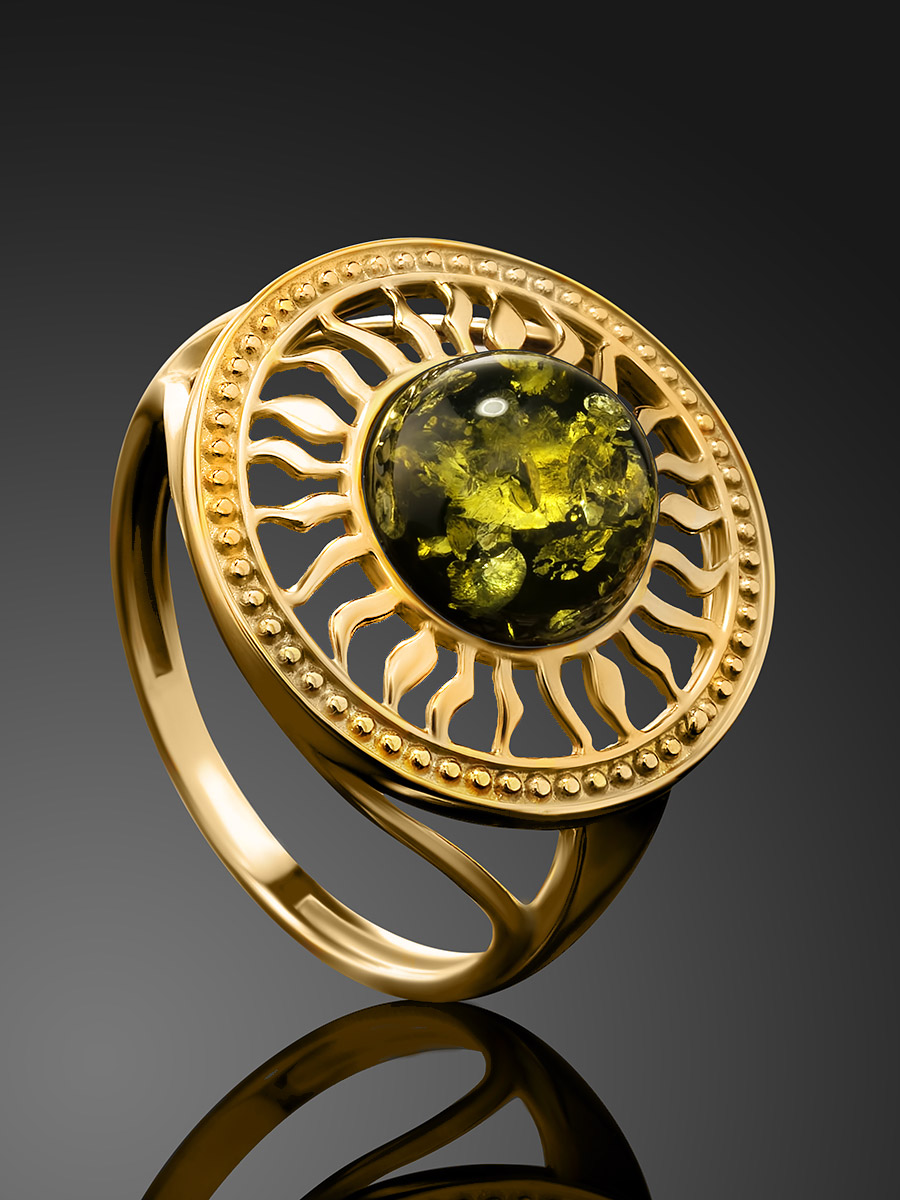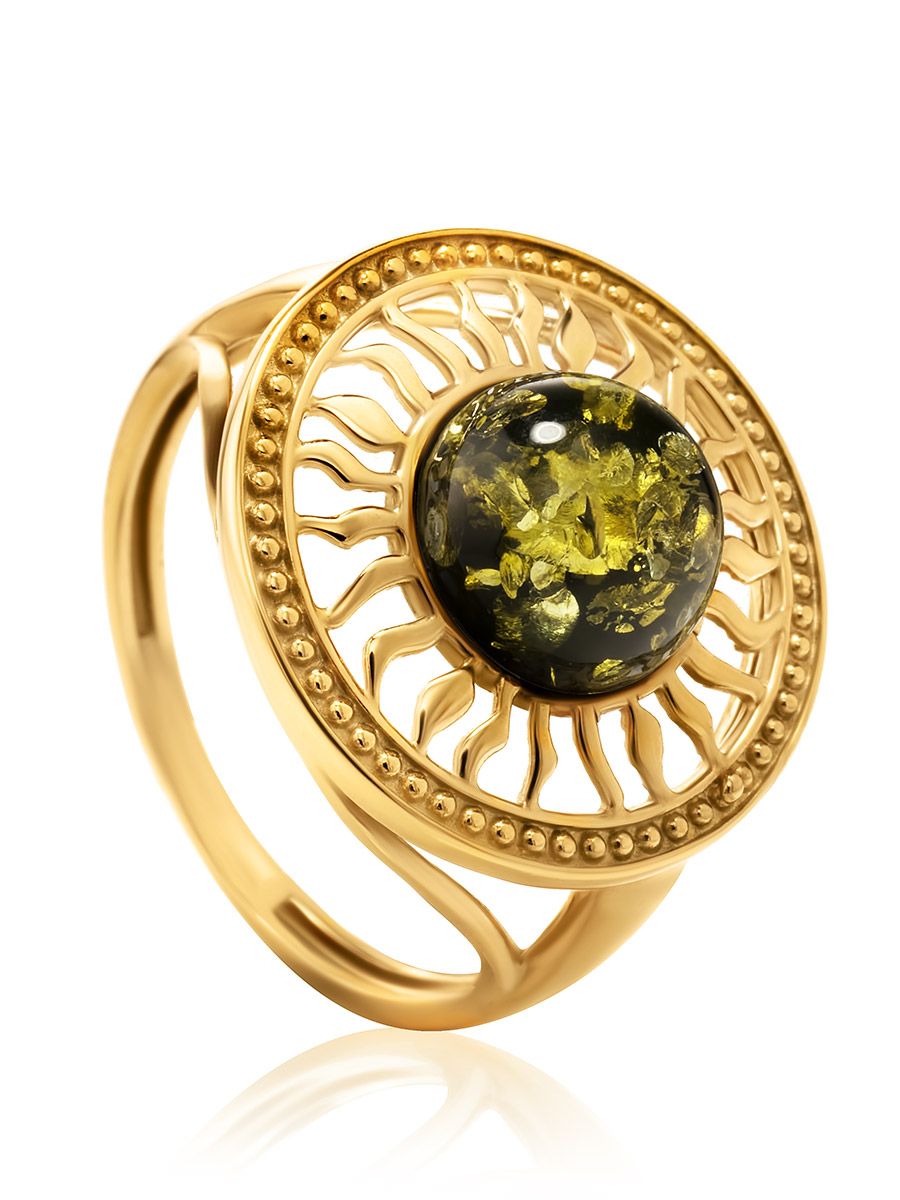 Эффектное позолоченное кольцо с зелёным янтарём «Парнас»