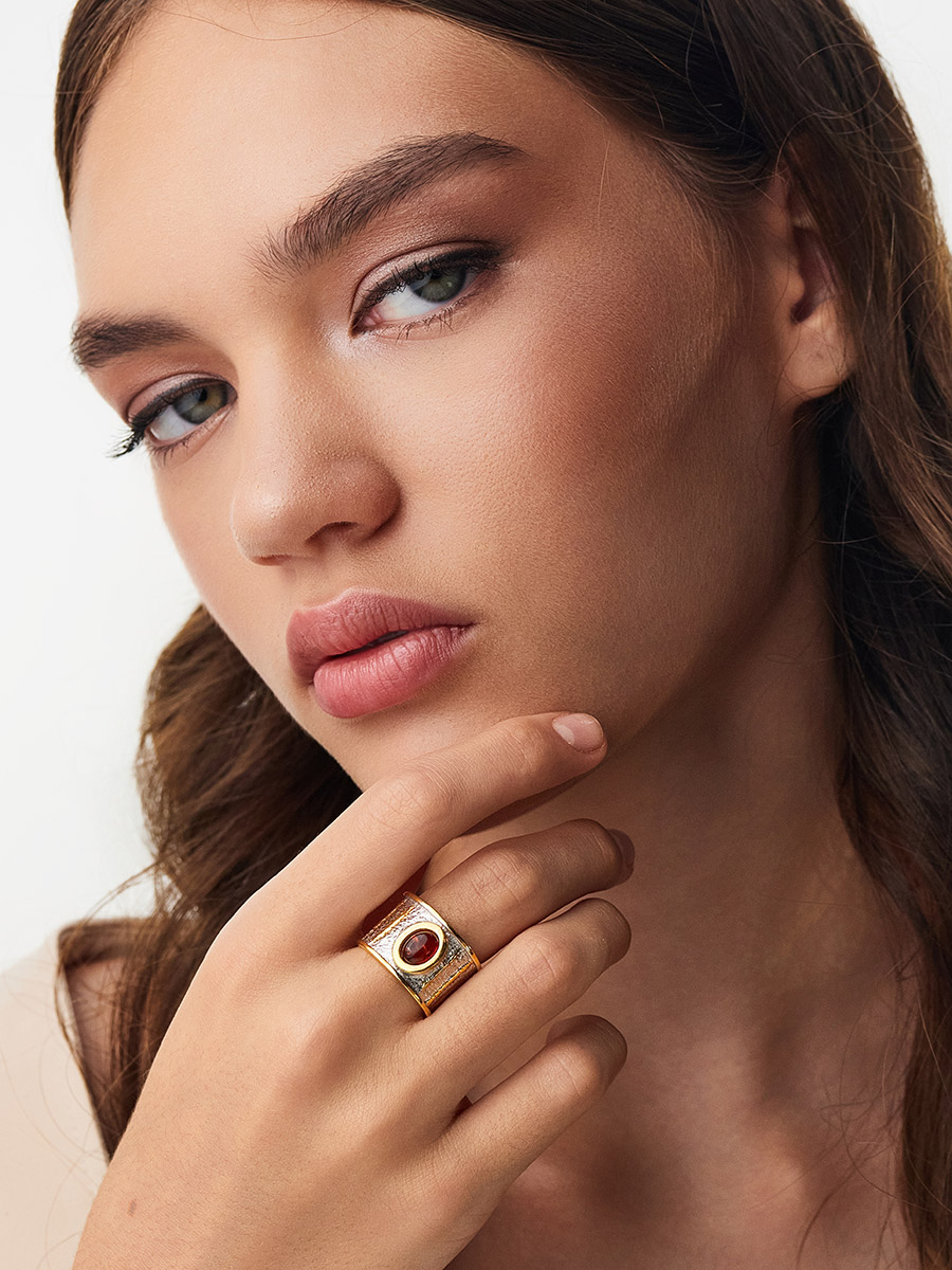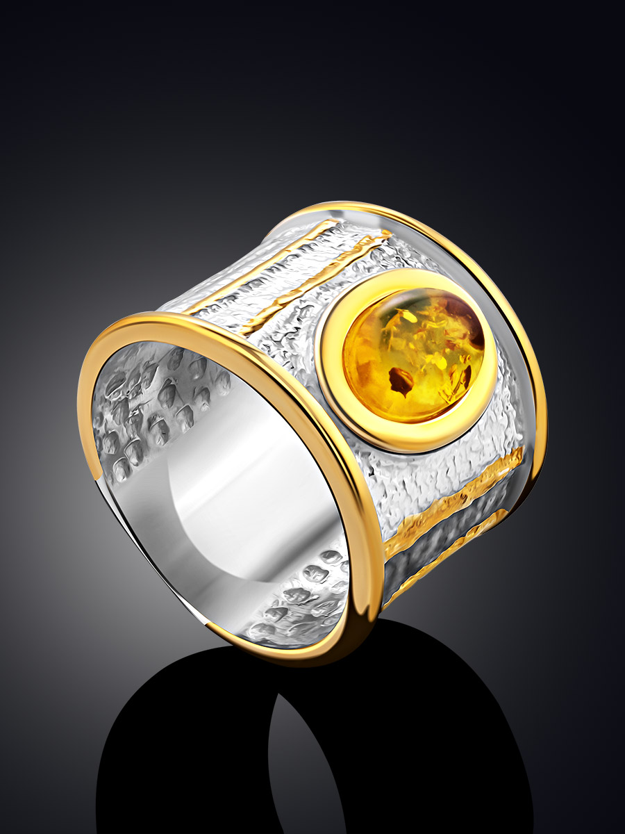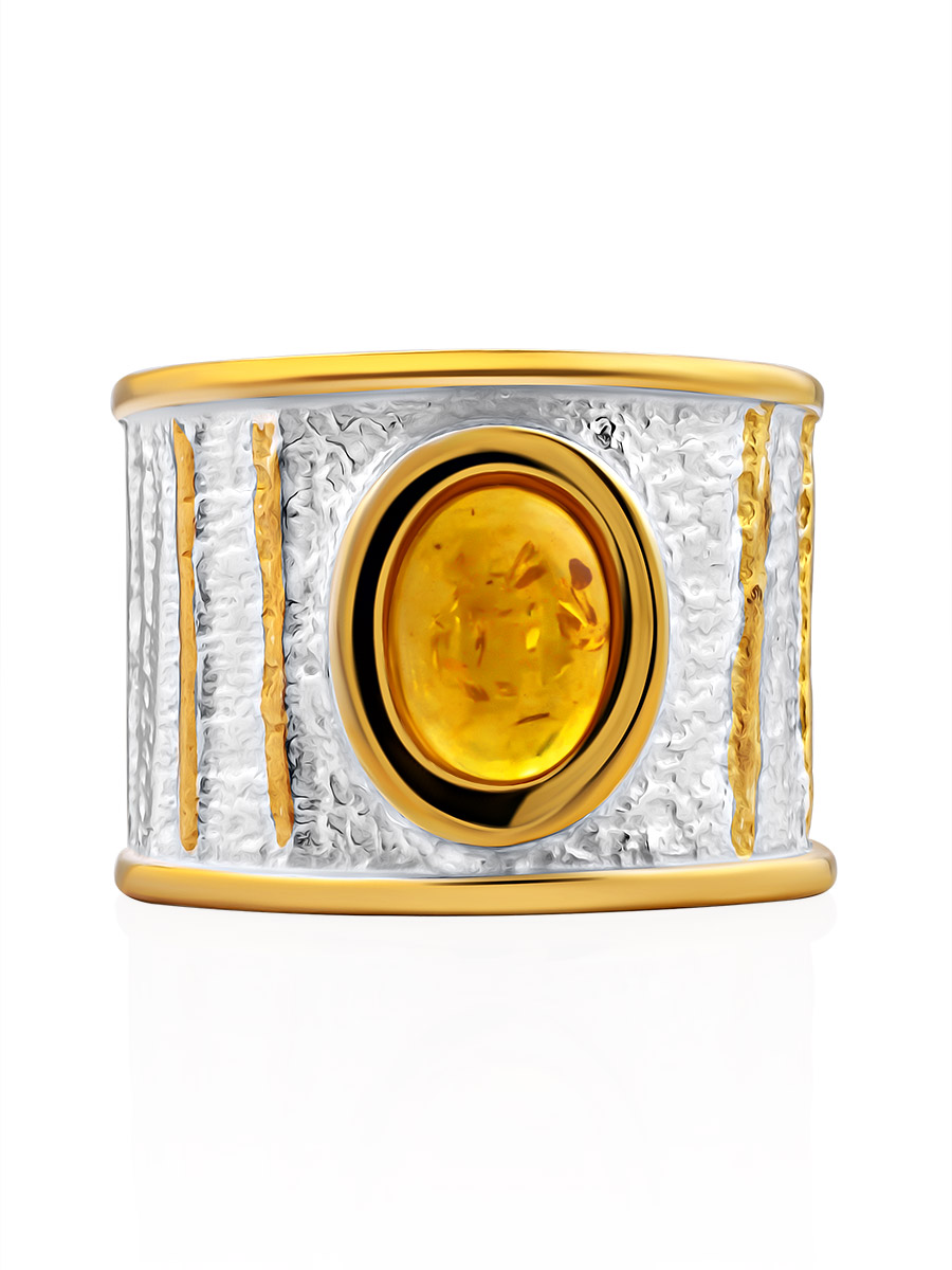 Эффектное широкое кольцо с коньячным янтарём «Эритрея»