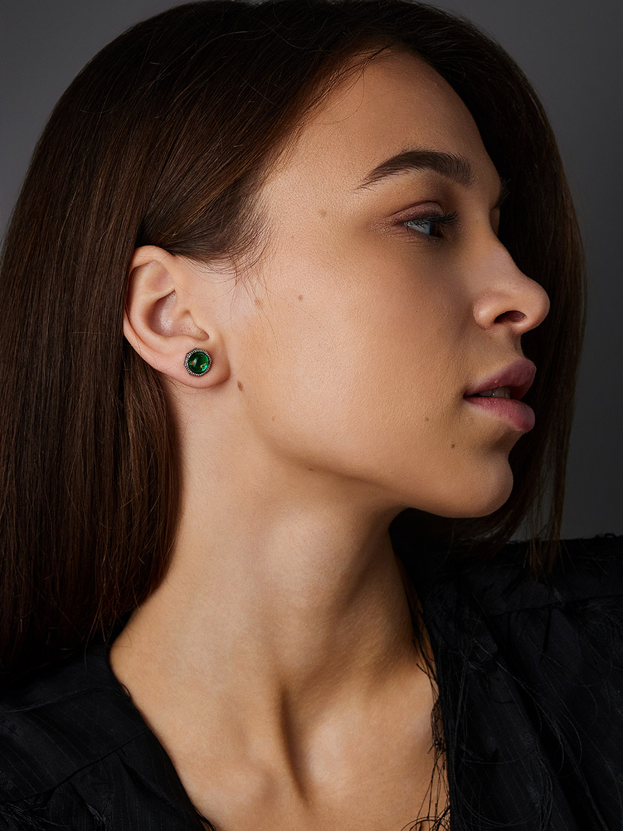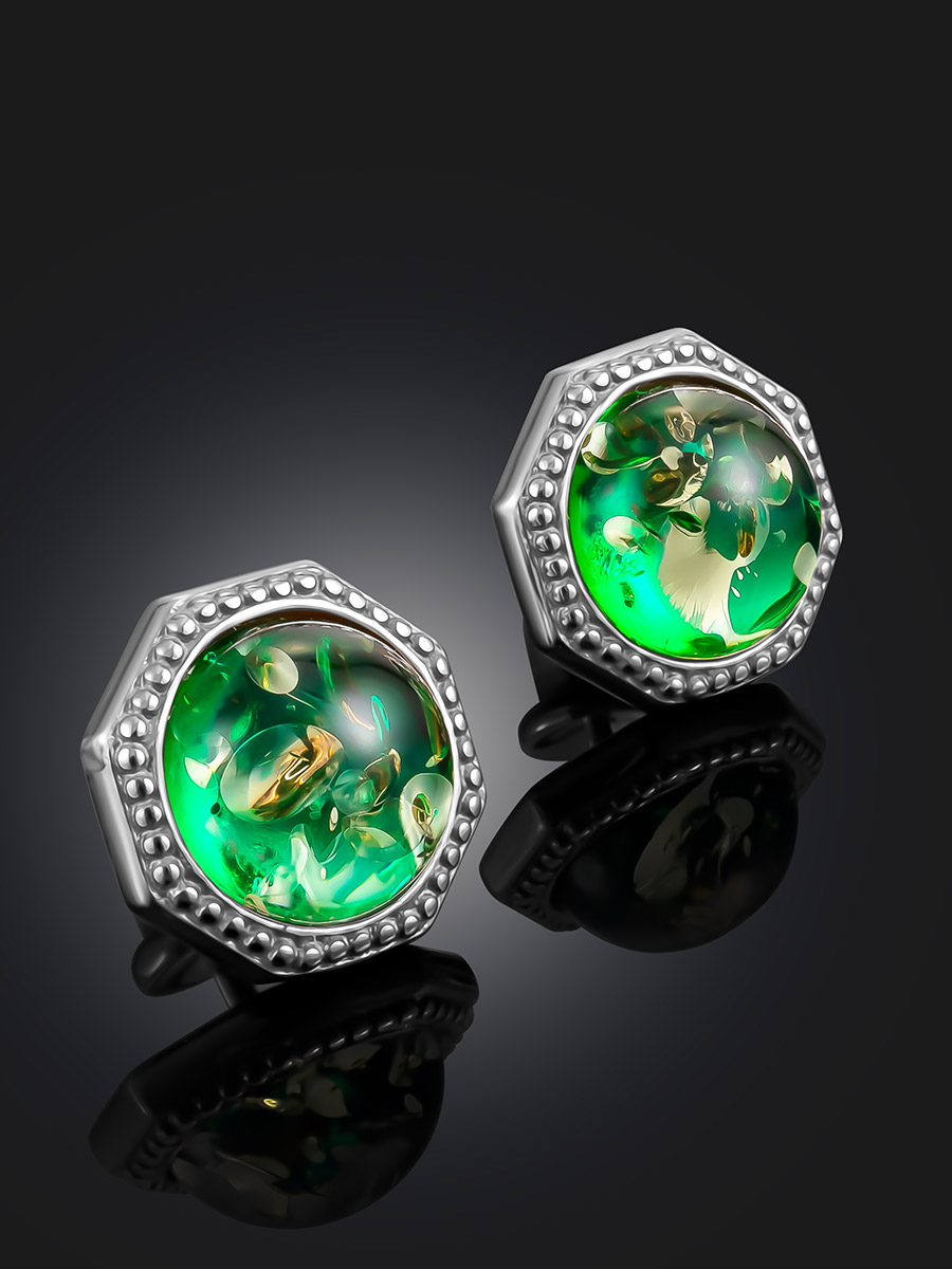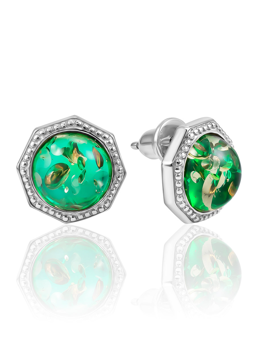Изящные серьги-гвоздики с изумрудно-зелёным янтарём «Шахерезада»