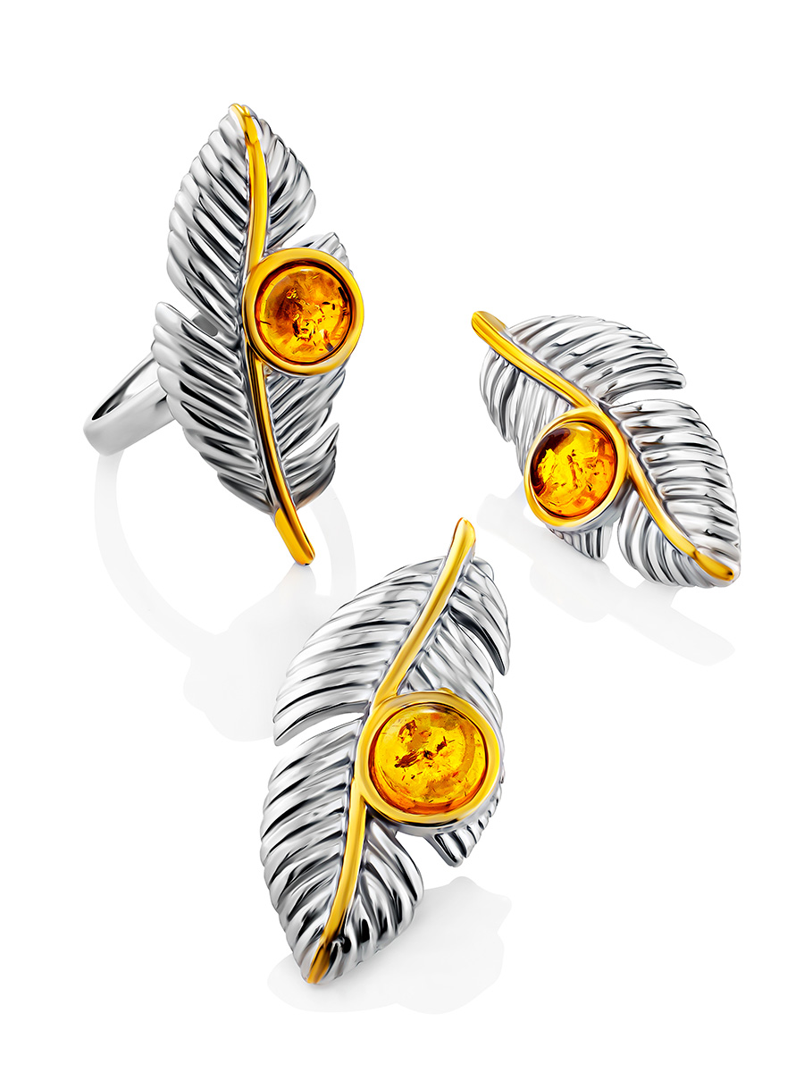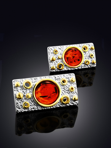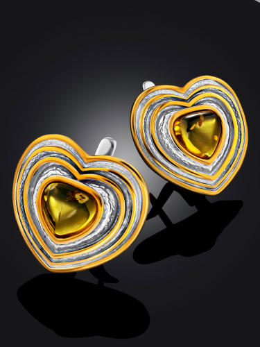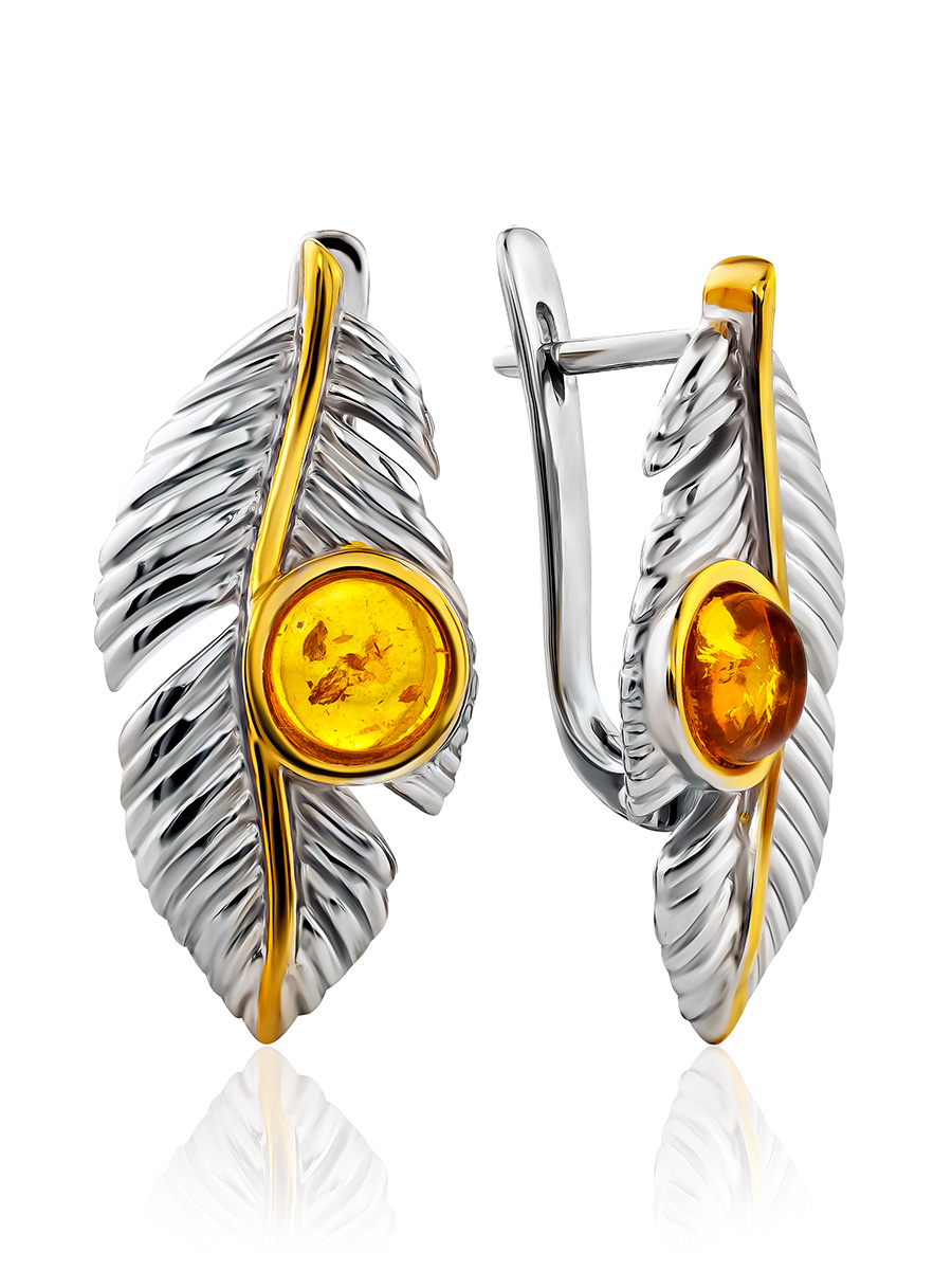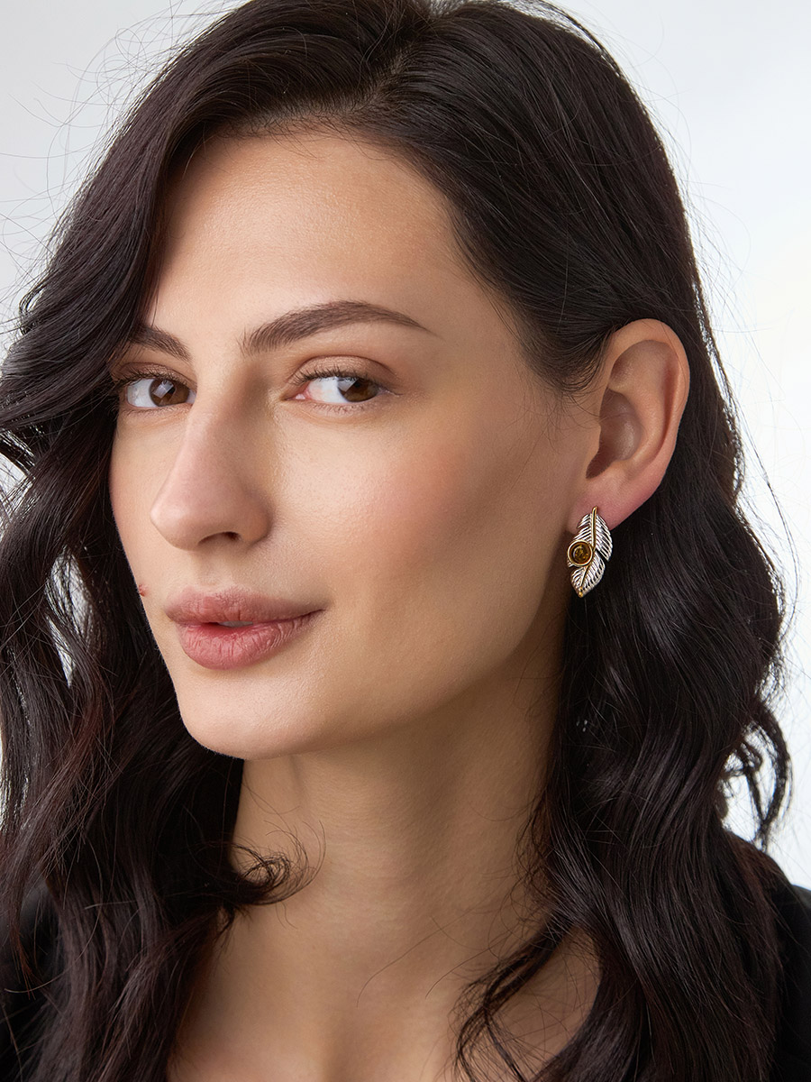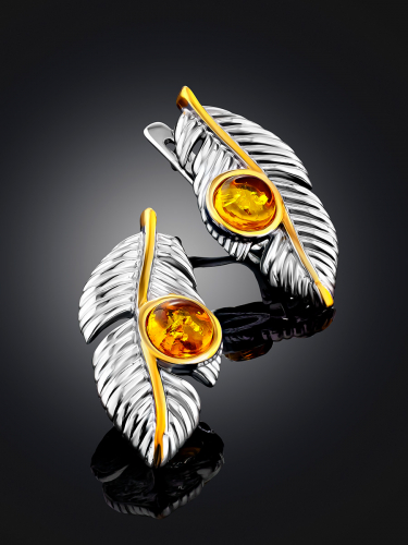 Изящные серьги, украшенные янтарём коньячного цвета «Павлин»