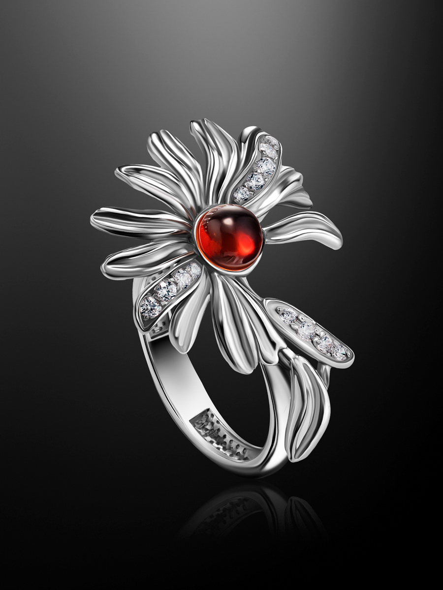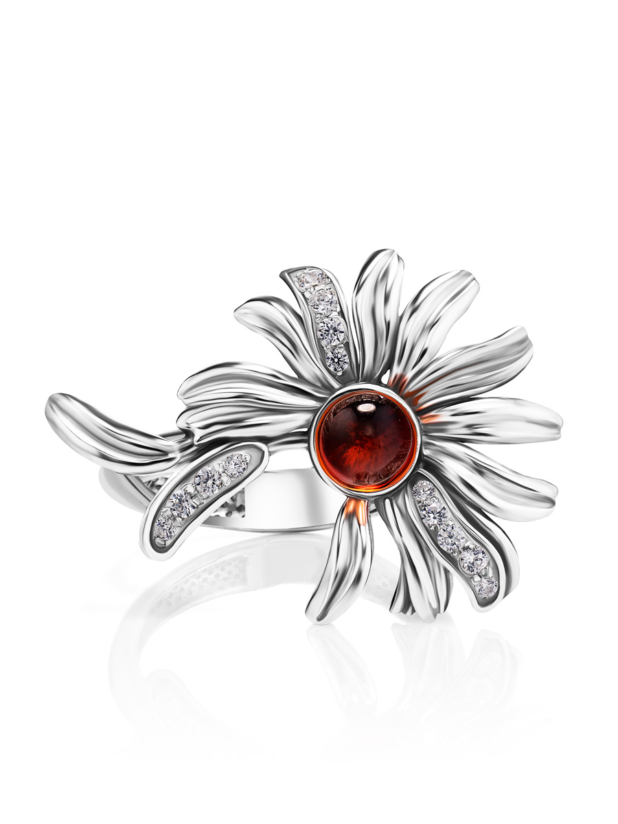 Изысканное кольцо «Ромашка» с янтарём и кристаллами