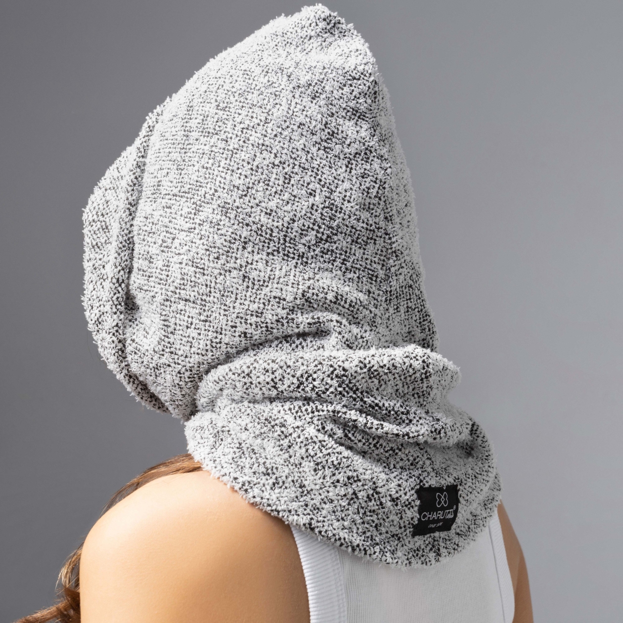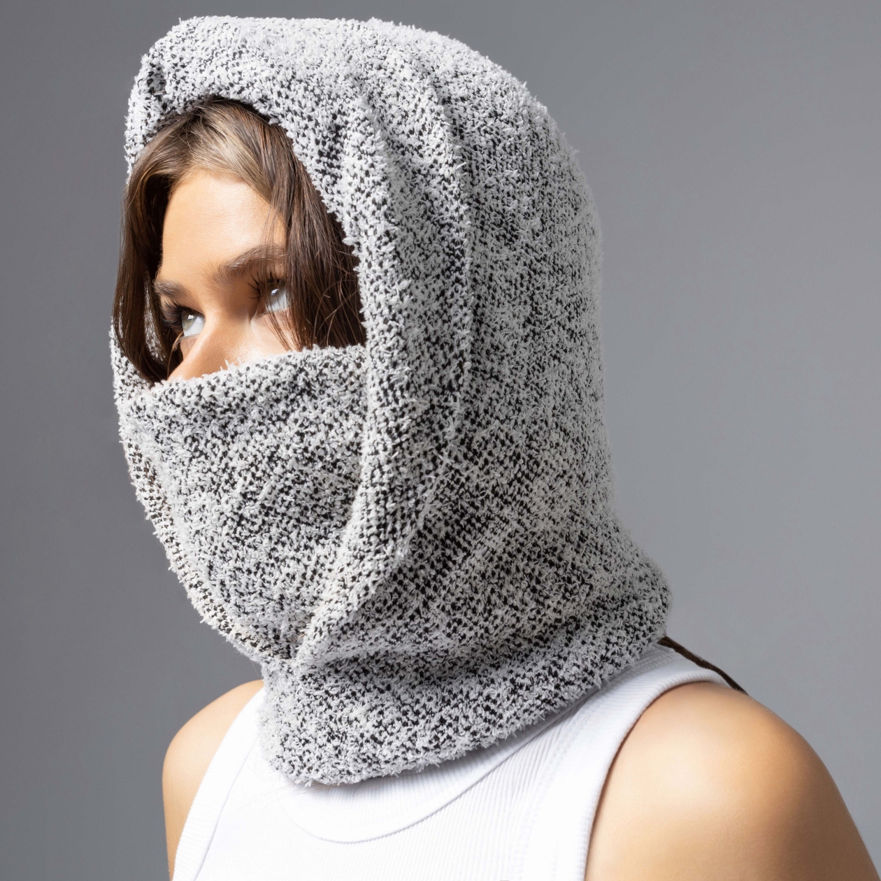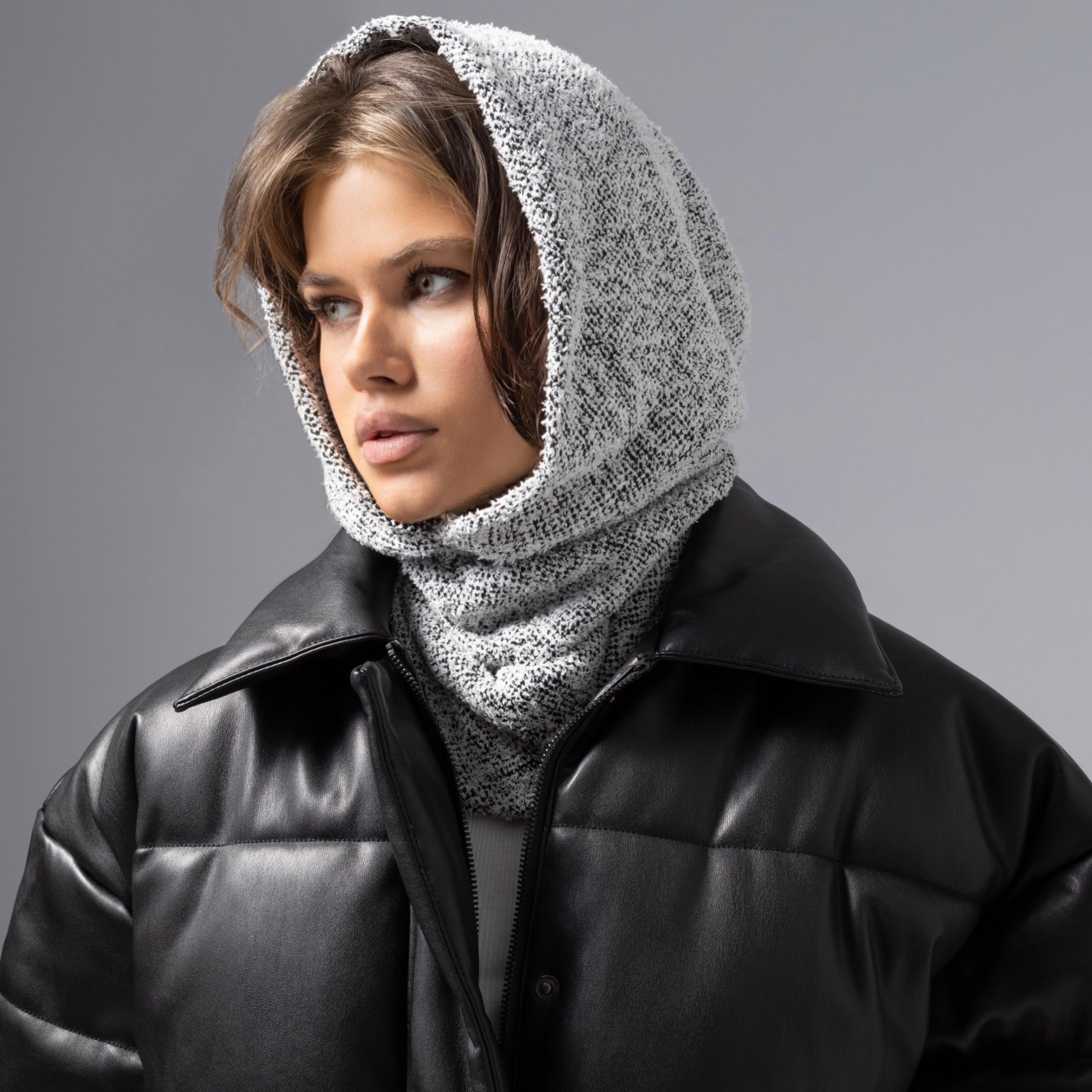 Городская леди таит свои чувства под уютным капюшоном ЧАРУТТИ, выбирает маршрут без оглядки и никогда не теряет своего шарма. Мягкая текстура, аристократичный серый – просто надень, и весь город подчинен тебе. Капюшон-балаклава из вязаного трикотажа легко драпируется, плотно прилегает, защищая от ветра. Можно прикрывать лицо и нет. Идеально для городских прогулок и дерзких образов с настроением свободы. Глубина изделия 30 см, двусторонний.