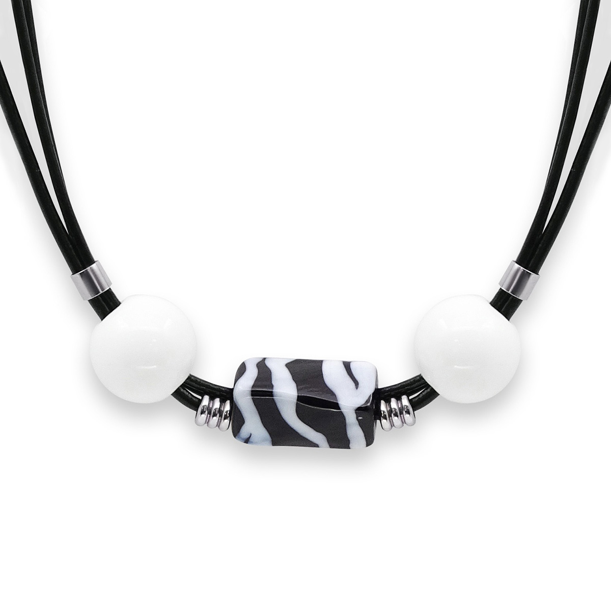 Колье изготовлено из натуральной кожи, муранского стекла и гипоаллергенной ювелирной стали, что очень важно для людей с чувствительной кожей. Металл не темнеет и не подвергается воздействиям окружающей среды, надолго обеспечивая красивый внешний вид изделия. Длина колье - 46 см + 5 см. удлиняющая цепочка. Размер стеклянного элемента - 1,4х2,3 см. Диаметр шаров - 1,5 см. Вес - 35 гр.