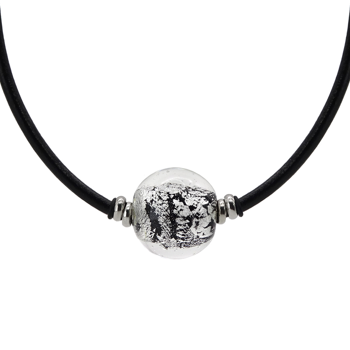 Колье изготовлено из натуральной кожи, муранского стекла и гипоаллергенной ювелирной стали, что очень важно для людей с чувствительной кожей. Металл не темнеет и не подвергается воздействиям окружающей среды, надолго обеспечивая красивый внешний вид изделия. Длина колье - 46 см + 5 см. удлиняющая цепочка. Диаметр стеклянного шара - 2,5 см. Вес - 32 гр.