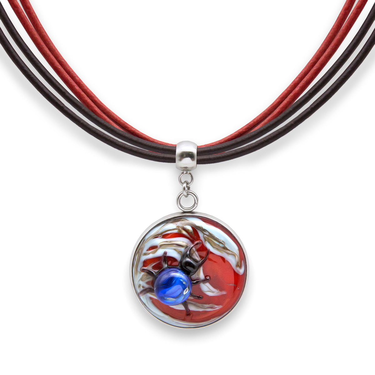 Колье изготовлено из натуральной кожи, муранского стекла и гипоаллергенной ювелирной стали, что очень важно для людей с чувствительной кожей. Металл не темнеет и не подвергается воздействиям окружающей среды, надолго обеспечивая красивый внешний вид изделия. Длина колье - 46 см + 5 см. удлиняющая цепочка. Диаметр стеклянного элемента - 2,5 см. Вес - 14 гр.