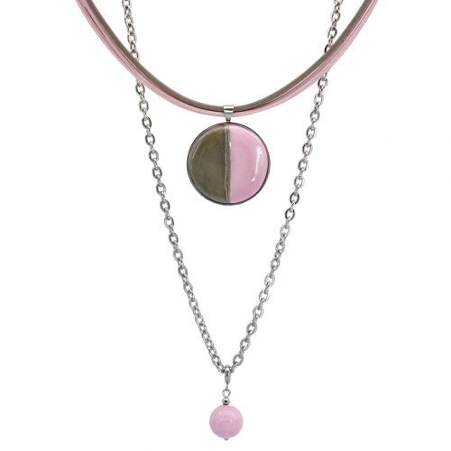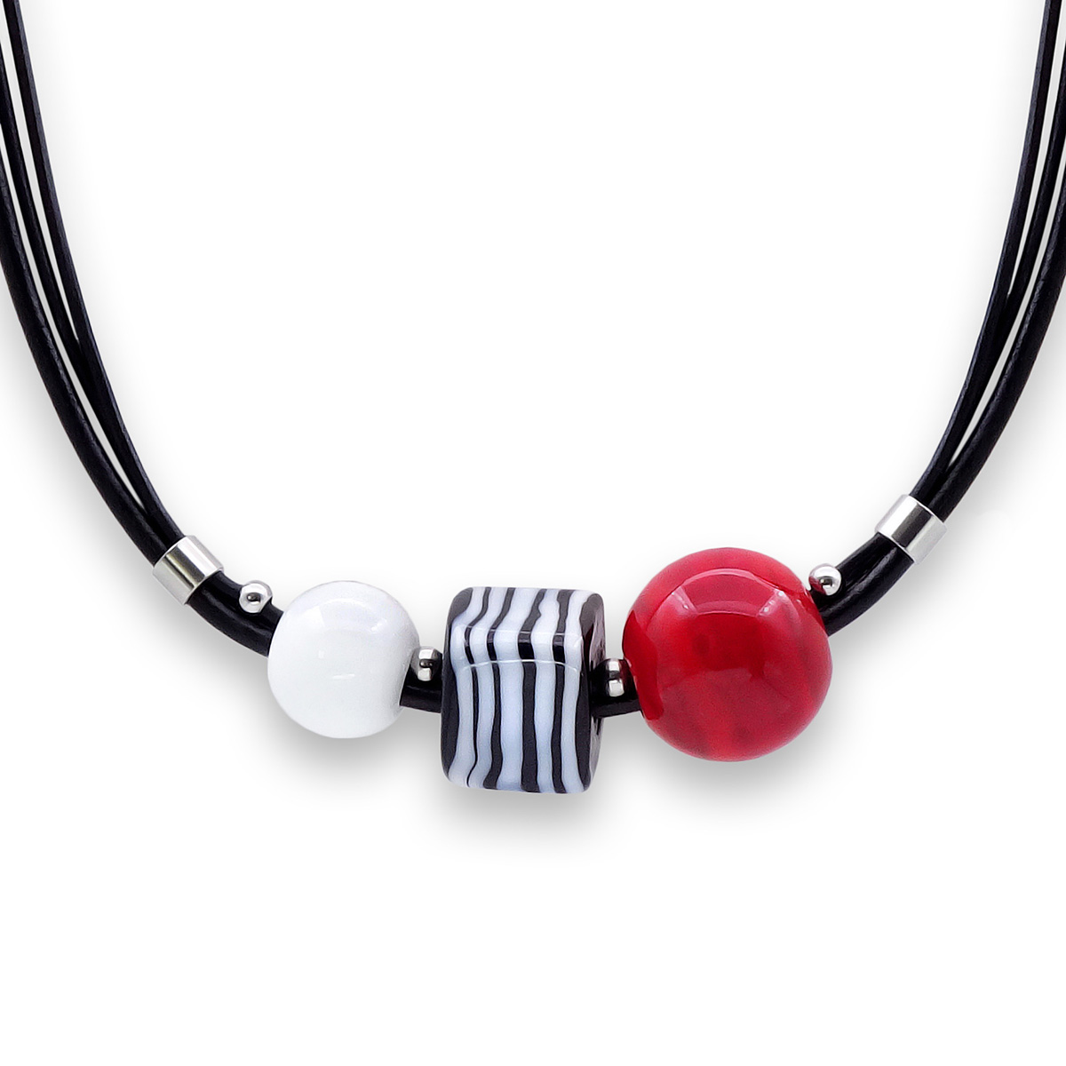 Колье изготовлено из натуральной кожи, муранского стекла и гипоаллергенной ювелирной стали, что очень важно для людей с чувствительной кожей. Металл не темнеет и не подвергается воздействиям окружающей среды, надолго обеспечивая красивый внешний вид изделия. Длина колье - 46 см + 5 см. удлиняющая цепочка. Диаметр стеклянных шароов - 2,2 и 1,5 см. Размер куба - 1,8х1,8 см. Вес - 37 гр.