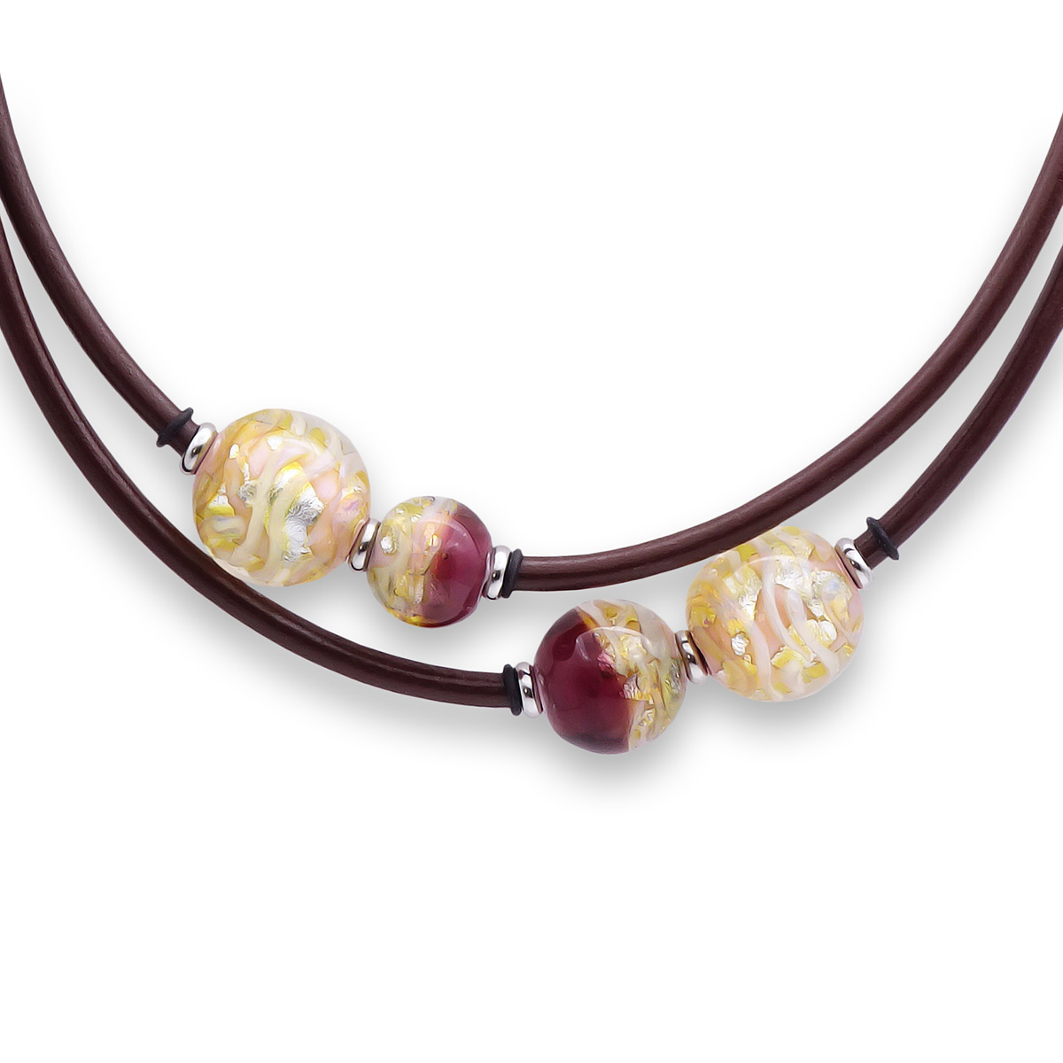 Колье изготовлено из натуральной кожи, муранского стекла и гипоаллергенной ювелирной стали, что очень важно для людей с чувствительной кожей. Металл не темнеет и не подвергается воздействиям окружающей среды, надолго обеспечивая красивый внешний вид изделия. Длина колье - 46 см + 5 см. удлиняющая цепочка. Диаметр стеклянных шаров - 1,5, 1,8 и 2,2 см. Вес - 44 гр.