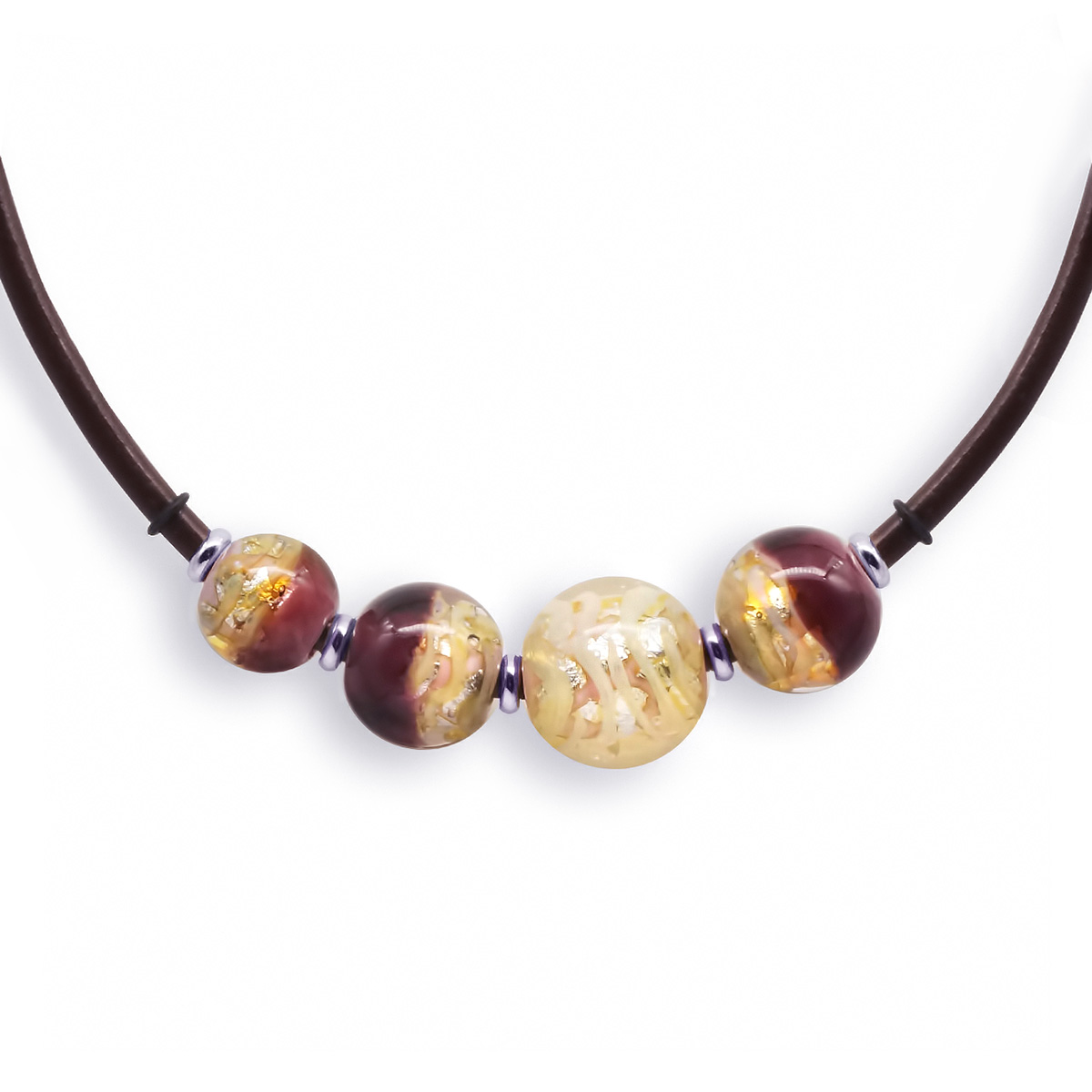 Колье изготовлено из натуральной кожи, муранского стекла и гипоаллергенной ювелирной стали, что очень важно для людей с чувствительной кожей. Металл не темнеет и не подвергается воздействиям окружающей среды, надолго обеспечивая красивый внешний вид изделия. Длина колье - 46 см + 5 см. удлиняющая цепочка. Диаметр стеклянных шаров - 1,5, 1,8 и 2,2 см. Вес - 44 гр.