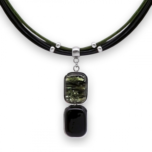 Колье изготовлено из натуральной кожи, муранского стекла и гипоаллергенной ювелирной стали, что очень важно для людей с чувствительной кожей. Металл не темнеет и не подвергается воздействиям окружающей среды, надолго обеспечивая красивый внешний вид изделия. Длина колье - 46 см + 5 см. удлиняющая цепочка. Диаметр стеклянных шаров - 1,5, 1,8 и 2,2 см. Вес - 35 гр.