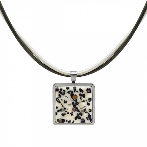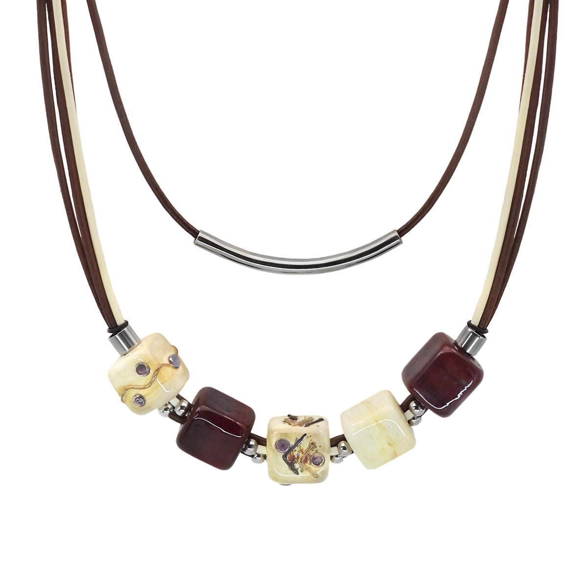 Колье изготовлено из натуральной кожи, муранского стекла и гипоаллергенной ювелирной стали, что очень важно для людей с чувствительной кожей. Металл не темнеет и не подвергается воздействиям окружающей среды, надолго обеспечивая красивый внешний вид изделия. Длина колье - 90 см + 5 см. удлиняющая цепочка. Размер стеклянных кубов - 1,3х2,1,3 см. Вес - 29 гр.