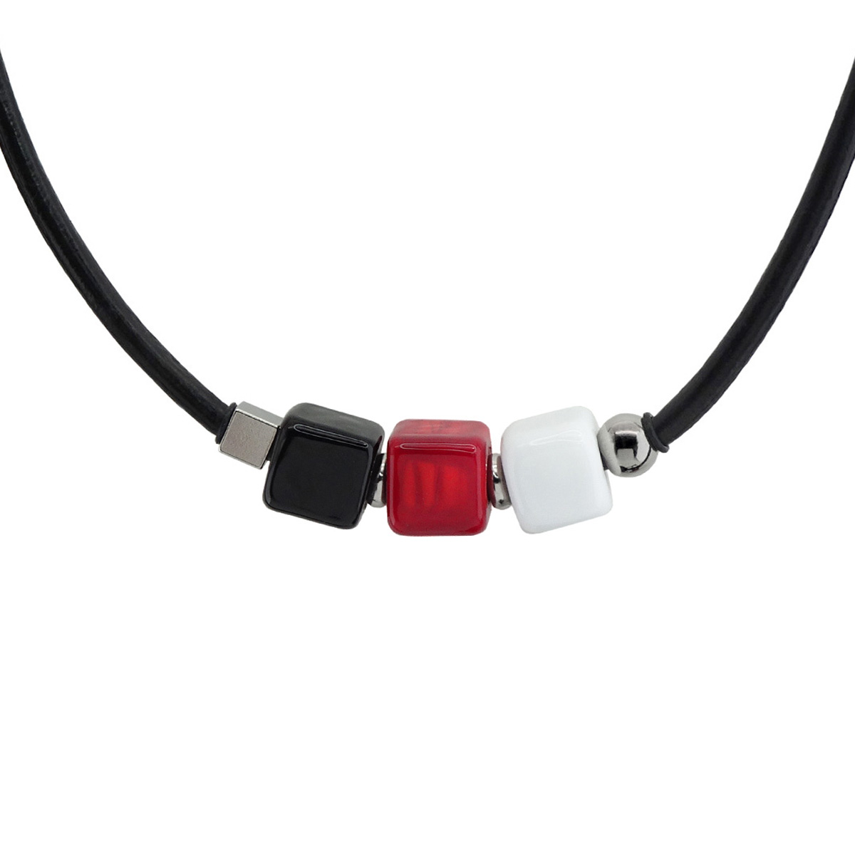Колье изготовлено из натуральной кожи, муранского стекла и гипоаллергенной ювелирной стали, что очень важно для людей с чувствительной кожей. Металл не темнеет и не подвергается воздействиям окружающей среды, надолго обеспечивая красивый внешний вид изделия. Длина колье - 43 см + 5 см. удлиняющая цепочка. Размер куба - 1х1 и 0,5 см. Вес - 32 гр.
