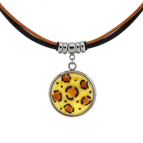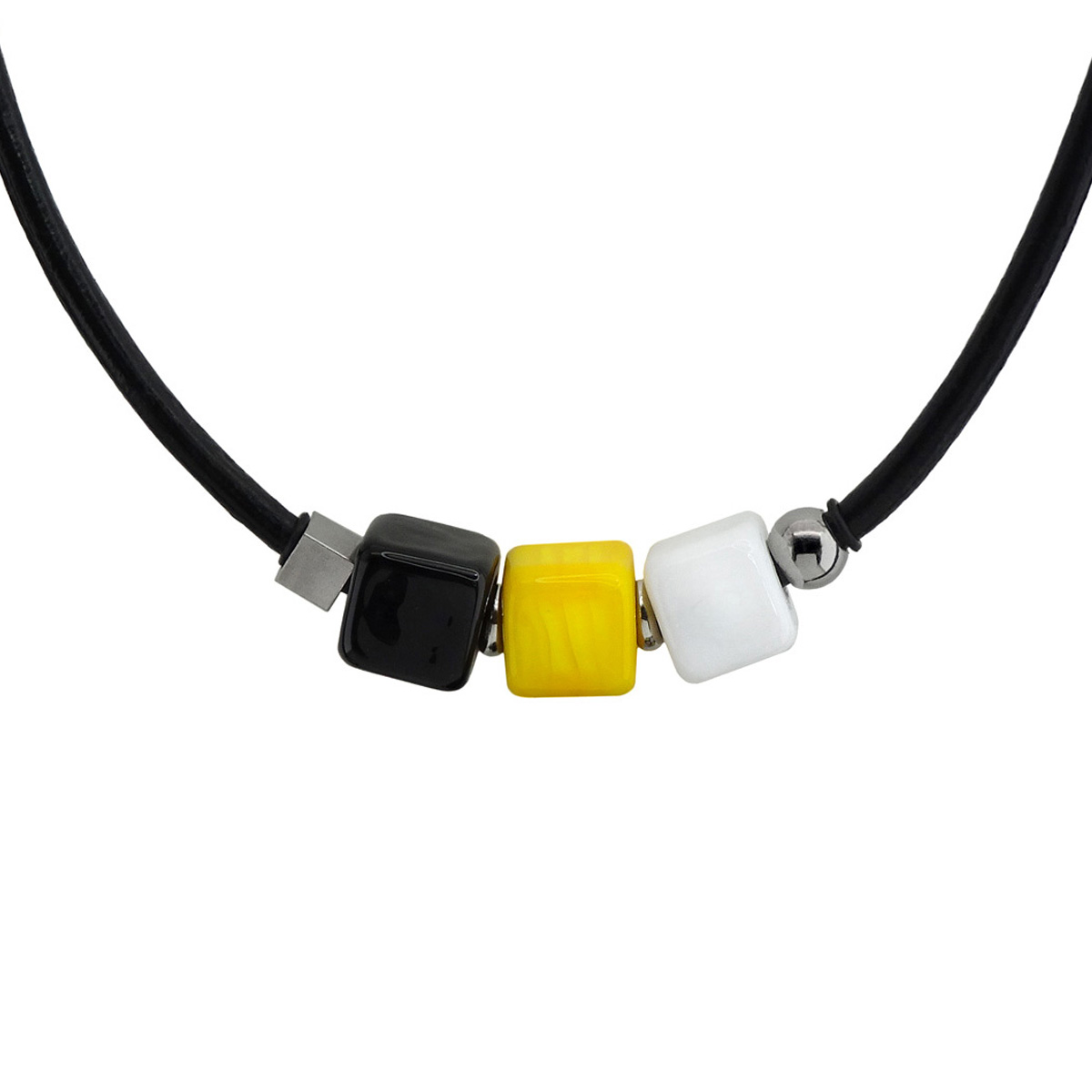 Колье изготовлено из натуральной кожи, муранского стекла и гипоаллергенной ювелирной стали, что очень важно для людей с чувствительной кожей. Металл не темнеет и не подвергается воздействиям окружающей среды, надолго обеспечивая красивый внешний вид изделия. Длина колье - 43 см + 5 см. удлиняющая цепочка. Размер куба - 1х1 и 0,5 см. Вес - 32 гр.