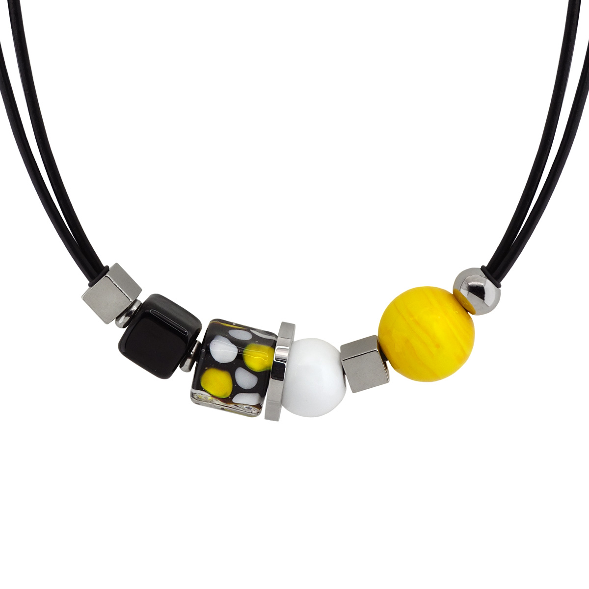 Колье изготовлено из натуральной кожи, муранского стекла и гипоаллергенной ювелирной стали, что очень важно для людей с чувствительной кожей. Металл не темнеет и не подвергается воздействиям окружающей среды, надолго обеспечивая красивый внешний вид изделия. Длина колье - 46 см + 5 см. удлиняющая цепочка. Диаметр стеклянных шароов - 1,6 и 1,2 см. Размер куба - 1x1 и 1,2х1,4 см. Вес - 32 гр.